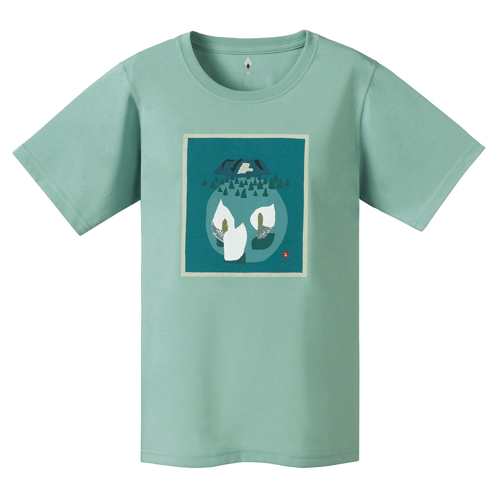 コットンのような自然な風合いと、優しい肌触りを持ちながらも、優れた速乾性と通気性を兼ね備えた快適素材です。トレッキングだけでなく、日常でも快適な着用感です。「山の版画家」畦地梅太郎さん(1999年没)による作品をプリントしています。