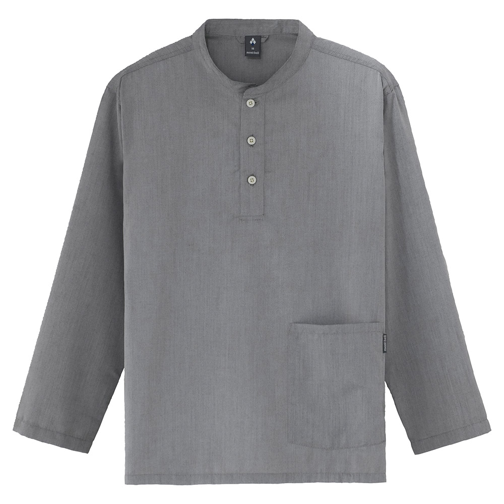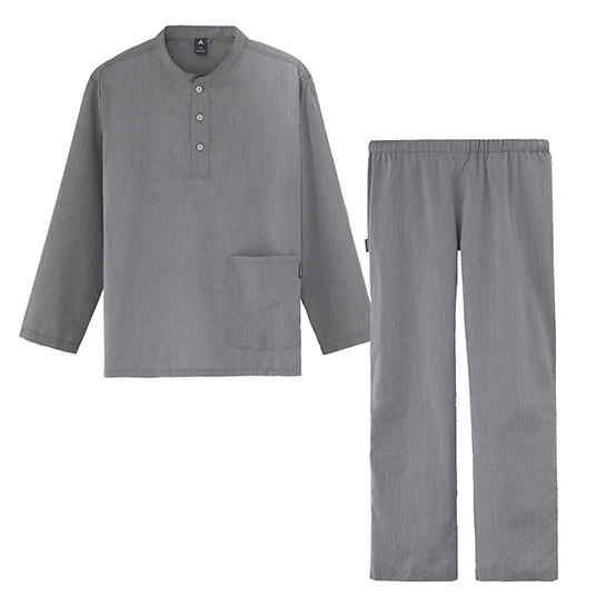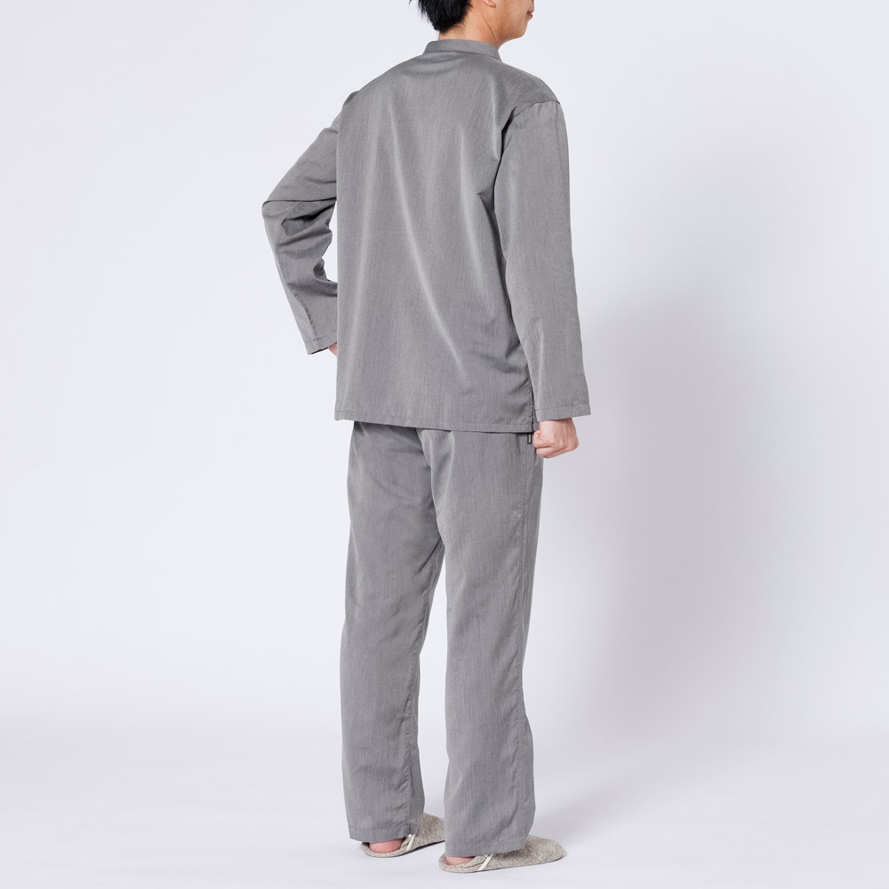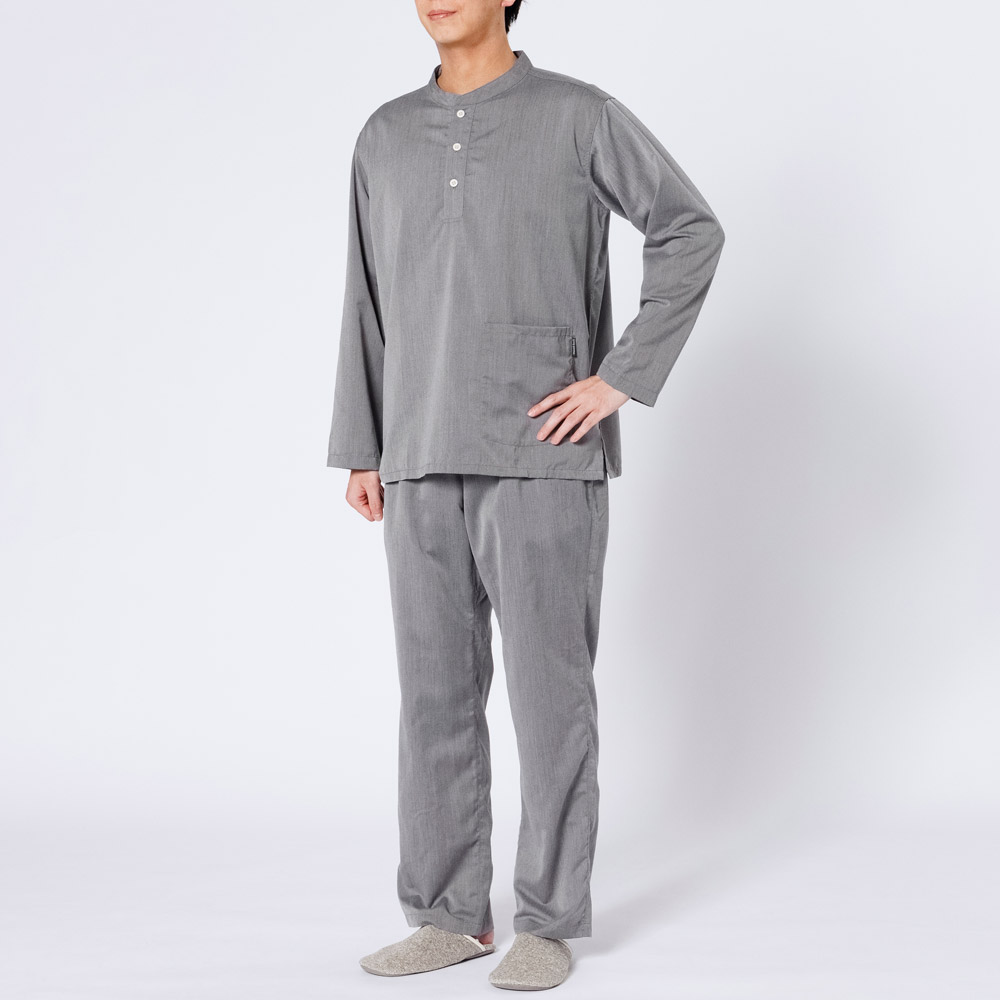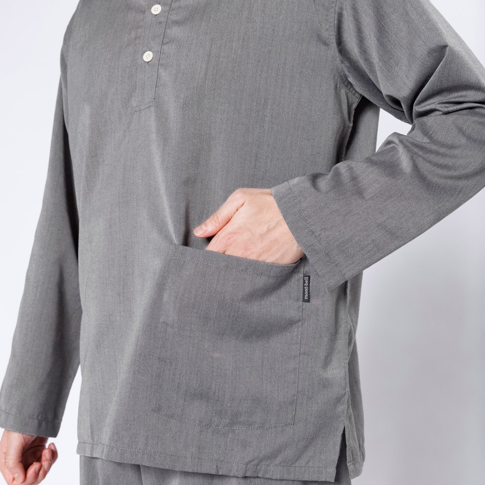 旅先でのリラックスウエアに適した上下セットの長袖パジャマです。ハリがあり、シワになりにくい生地を使用しています。洗濯をしても乾きやすく、旅の最中でも清潔な状態を保てます。