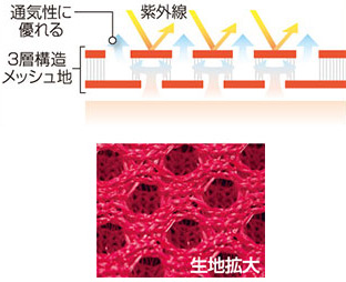 表と裏の生地を若干ずらすことで、日よけ機能と通気性を両立しています。