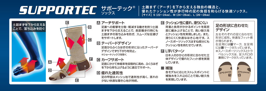 土踏まず(アーチ)を下から支える独自の構造と、優れたクッション性により、歩行時の足の負担を和らげる高機能・快適ソックスです。耐久性と吸汗性・速乾性を併せ持つ高機能素材ウイックロン®を使用しています。