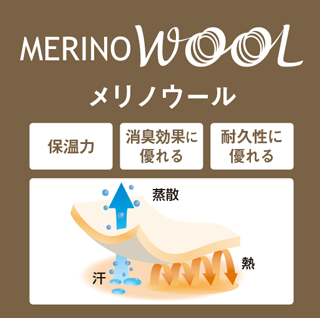 上質で繊維長の長い羊毛繊維を使用しているため、優れた保温性を持ちながらもウール特有のチクチク感がありません。発汗時にもウールの吸放湿性により、靴の中を快適な状態に保ち、消臭効果にも優れています。防縮加工により洗濯時の縮みも防ぎます。