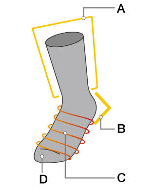 足首からふくらはぎの形状に沿ったテーパードデザインでずり下がりを防ぎます。