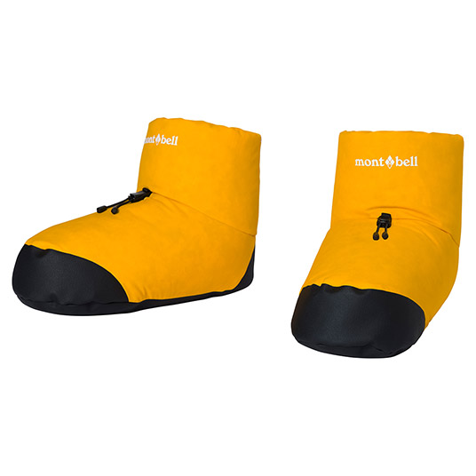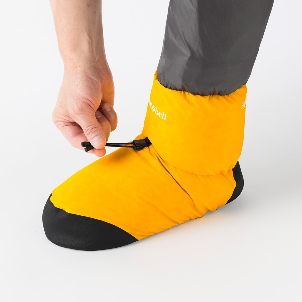 防水透湿性と防滴性を備えたスーパー ドライテック®に、高品質ダウンをたっぷり封入したフットウォーマーです。裏地には、ずれにくい起毛メッシュ地を使用し、就寝時や歩行時にも脱げにくくなっています。ドローコードで足首のフィット感が調節できます。足底には耐久性が高く滑りにくい高強度素材デュラグリップ®を配置し、履き口には雪の侵入を防ぐパウダースカートを備えているので、積雪時のテント外作業も可能です。