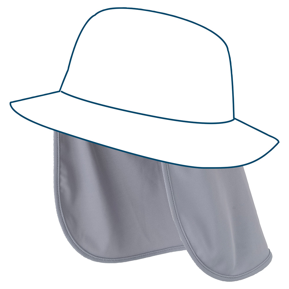 ハットに装着することで効果的に日差しを遮ることができる、トレッキングや野外作業に適した日除け布です。通気性とUVカット効果を両立した素材を使用し、蒸れにくく快適な着用感です。消臭機能も備えます。