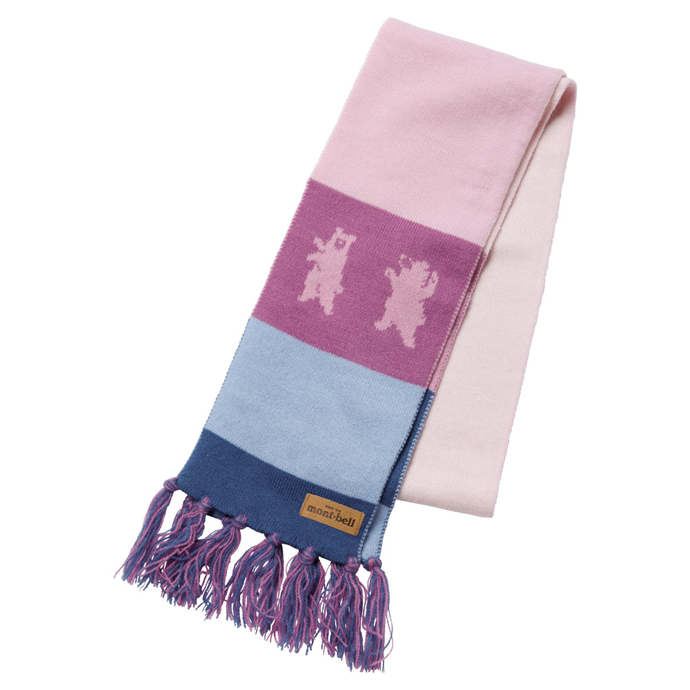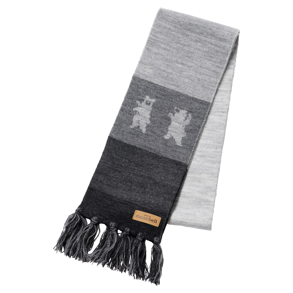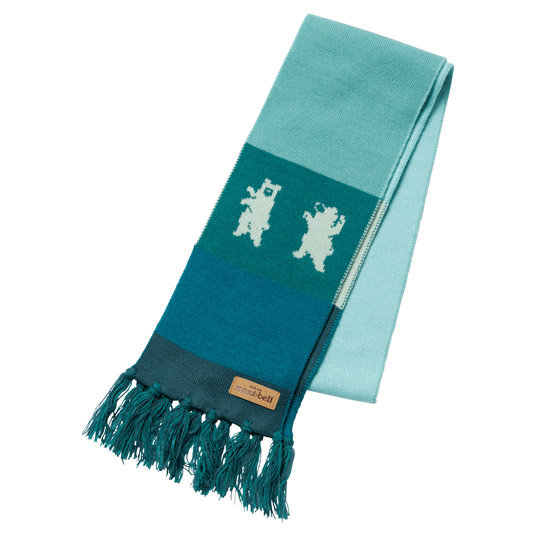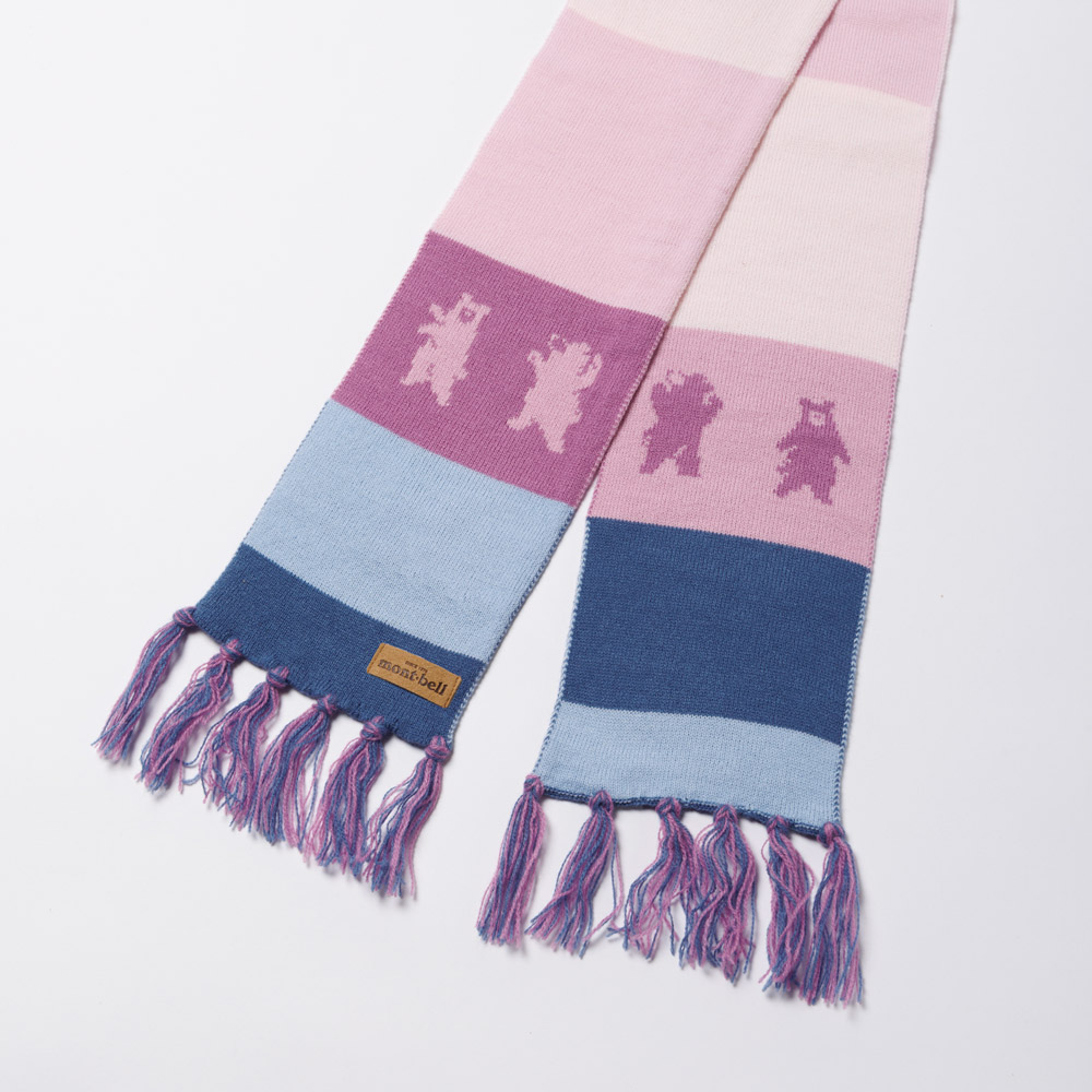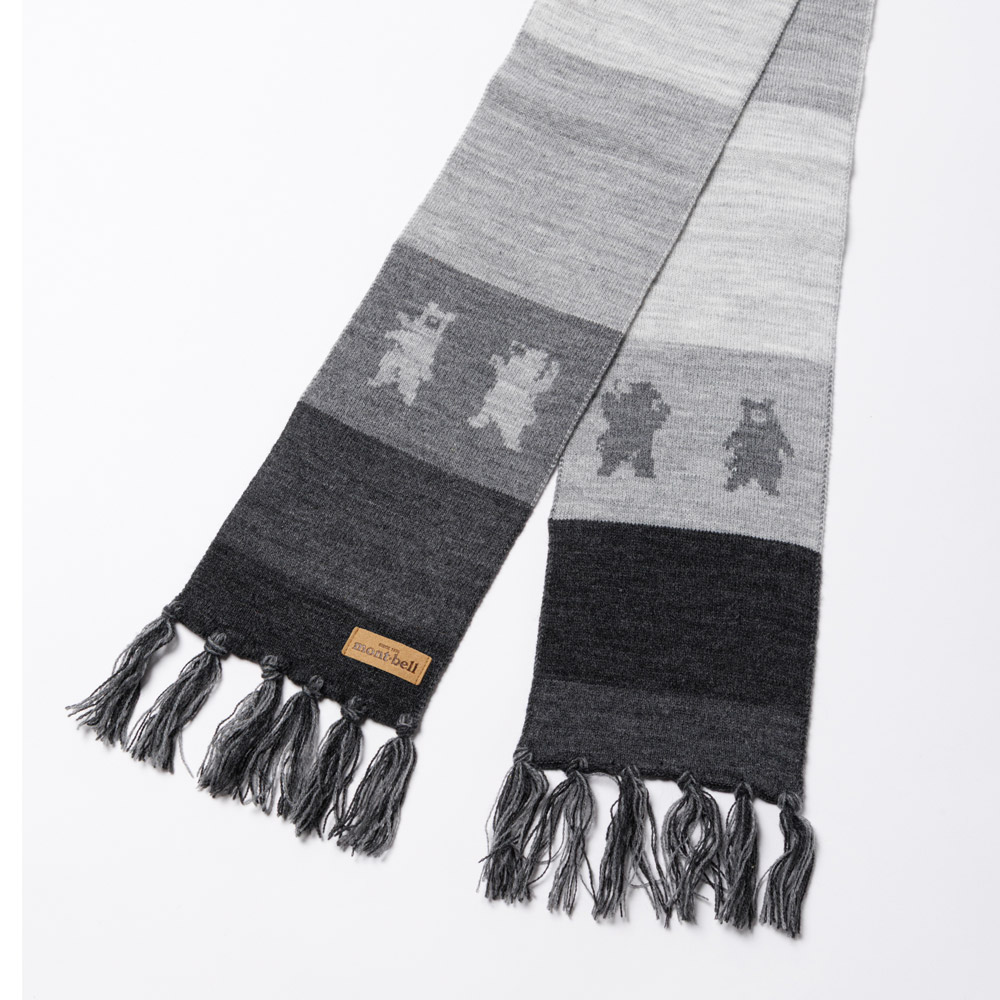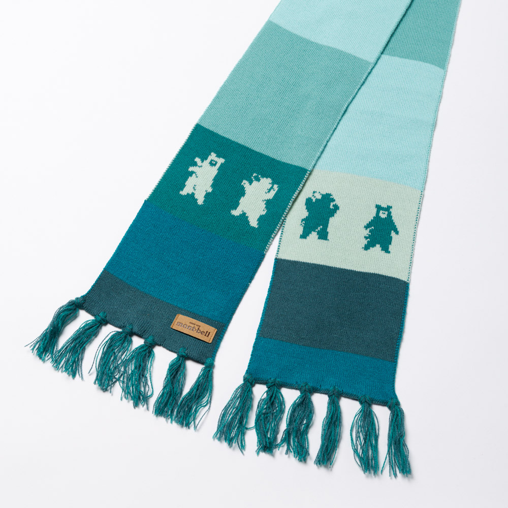 ダンスするクマのイラストを編み込んだ薄手のマフラーです。先端にフリンジをあしらっています。