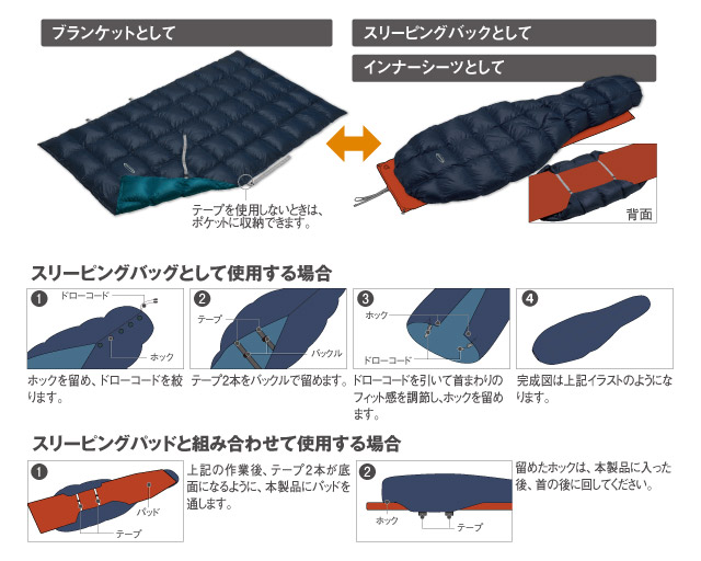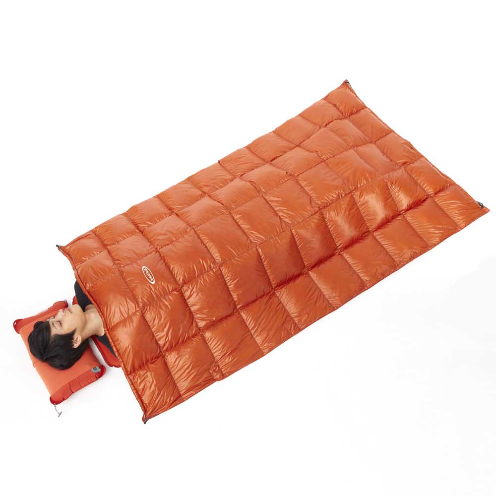 キャンプから荷物の軽量化が必要なスピードハイクまで、さまざまなシーンで活躍する簡易スリーピングバッグです。表地には軽量性と強度を両立した独自の素材、中綿には超高品質800フィルパワー・EXダウンを使用し、保温性と収納時の軽量コンパクト性を両立。同等の保温性能を持つダウンスリーピングバッグと比較して、約20%の軽量化と収納時のコンパクト性を実現しています。簡単な操作で使用でき、大型のブランケットとしても活躍します。スタッフバッグ付き。長期保管用のストリージバッグが付属します。
