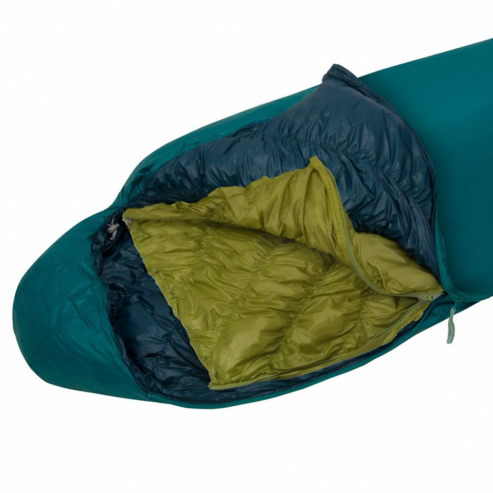 高品質な800フィルパワー・EXダウンを使用したストレッチ性を備えるシーツ。スリーピングバッグの中に入れて保温性を高めます。インナーシーツとして使用する場合は、スリーピングバッグの使用可能温度を約5℃下げることができます。夏場などは単体でも使用でき、足元まで全開してブランケットのようにも使えます。シーツ内部の隔壁を設けず、ダウンの保温性を最大限に生かすスパイダーバッフルシステムを搭載しています。