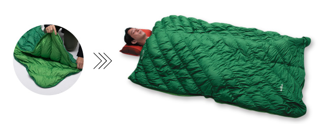 L字型ジッパーを開くと布団のように広げて使用可能。車中泊などでも活躍します。※写真はダウン O.D.スリーピングバッグ #3