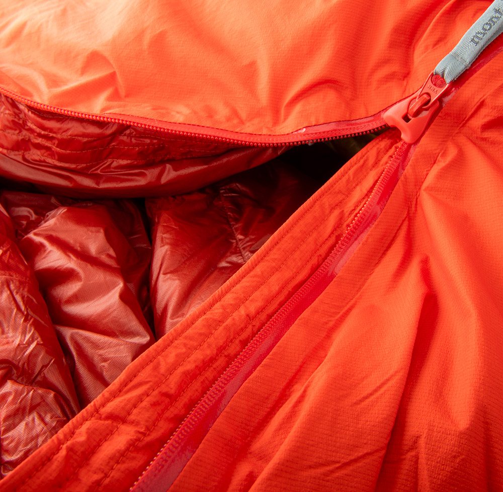内側に設けた中綿入りチューブでジッパーから入る冷気を防ぎます。上部にチューブ、下部にフラップを設けたドラフトチューブ、冷気の侵入とジッパーのかみを防止する中綿入りフラップがあります。
