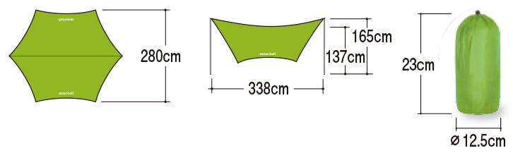 居住空間に余裕があり、風に対しても比較的強い六角形デザインの小型タープです。自転車やオートバイのソロツーリングなど、できるだけ荷物を軽くしたい行程に最適です。ヘッドランプなどを反射して光る軽量で強度に優れた張り綱、軽量アルミペグ、スタッフバッグが付属します。ポールは別売です。