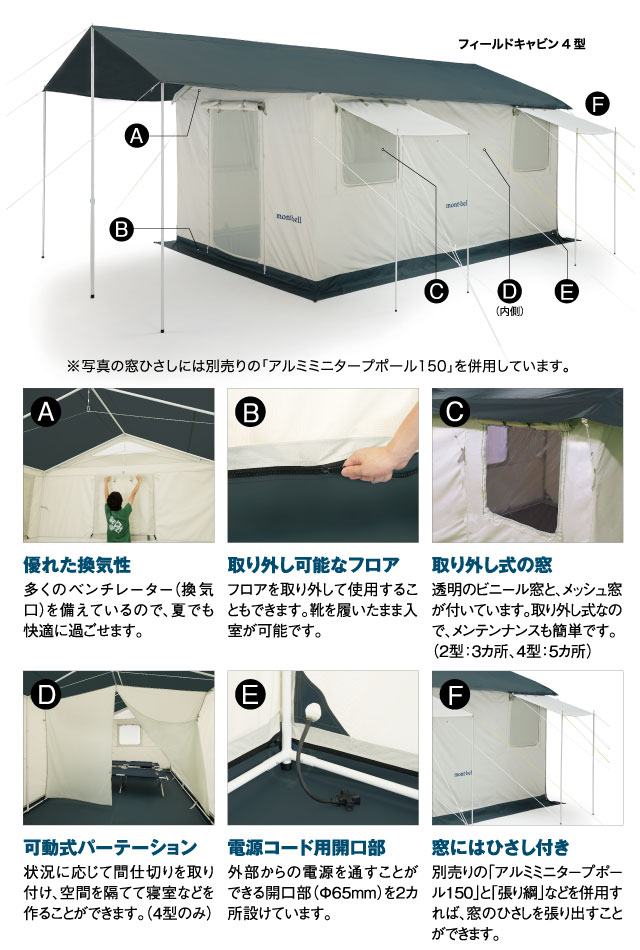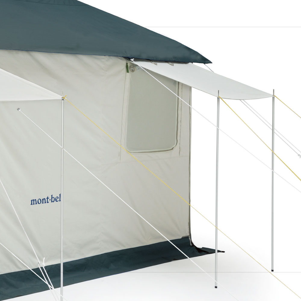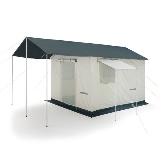 大人数でのキャンプやイベント、長期滞在にも対応する、耐久性に優れた大型テントです。テント本体の生地には長期間の使用にも安心の、耐久性・耐候性に優れた厚手素材を使用しています。本体フレームは丈夫なスチール製です。本体の屋根をそのまま前に2m延長し、屋外にも広々とした居住空間を設けています。