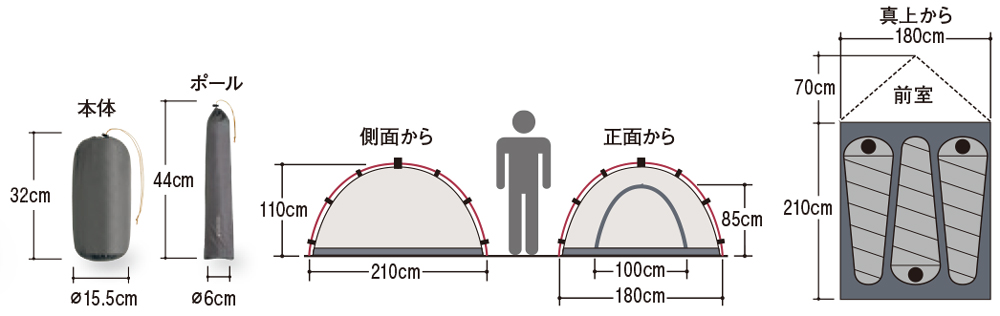 【構成】テント本体1、本体ポール1組、Φ3mm反射材入り張り綱4本、16cmアルミVペグ12本、ポール応急補修用パイプ1本