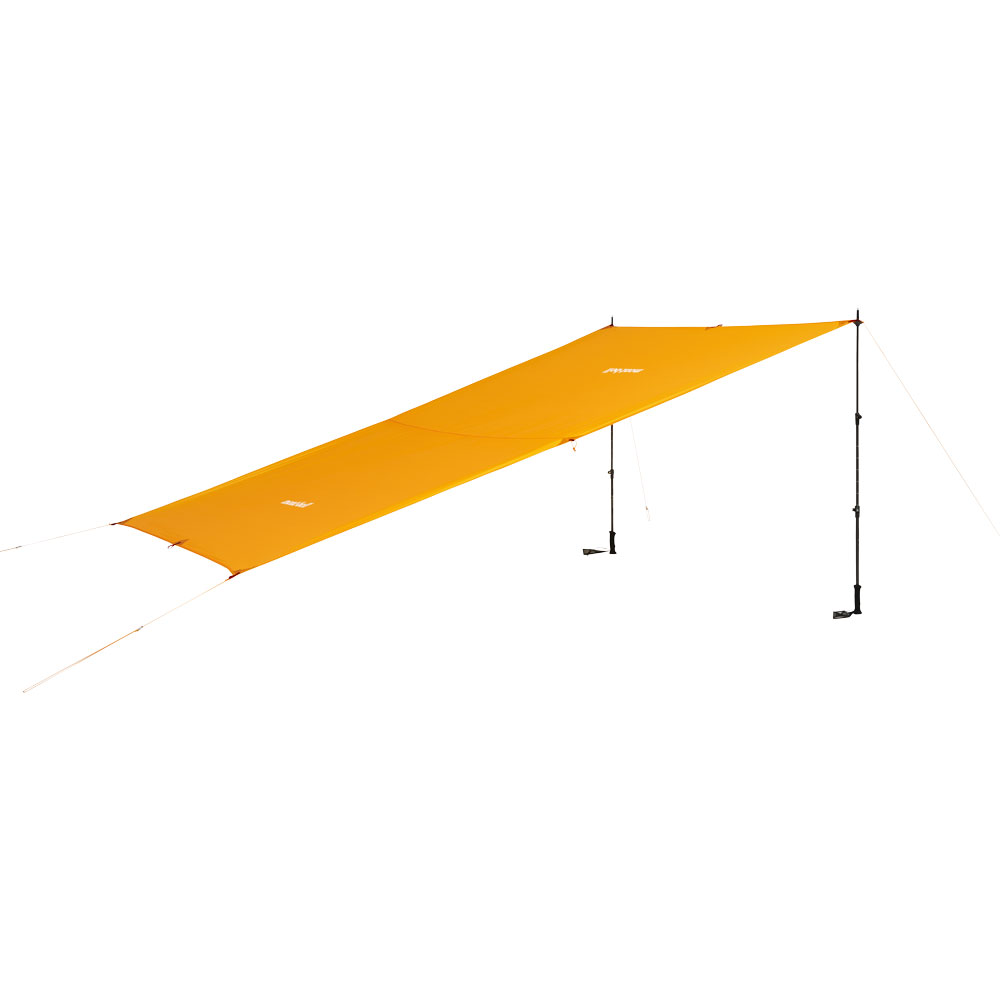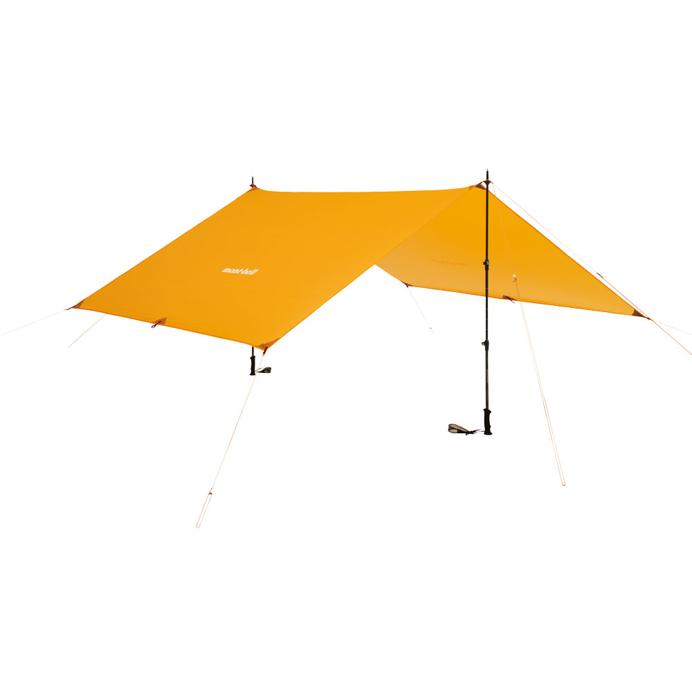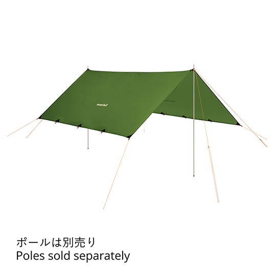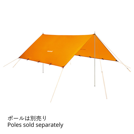 居住空間が広い長方形型タープです。軽量性と耐久性を両立した新開発のナイロンを使用。保水しにくく伸びにくいので、生地の垂れ下がりが少なくハリを保ちます。トレッキングポールなどでも設営できるループが付いており、状況に合わせた設営が可能です。5~6人での使用に適したサイズです。ポールは別売です。