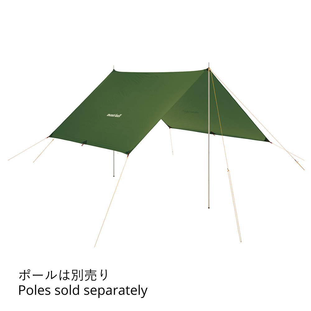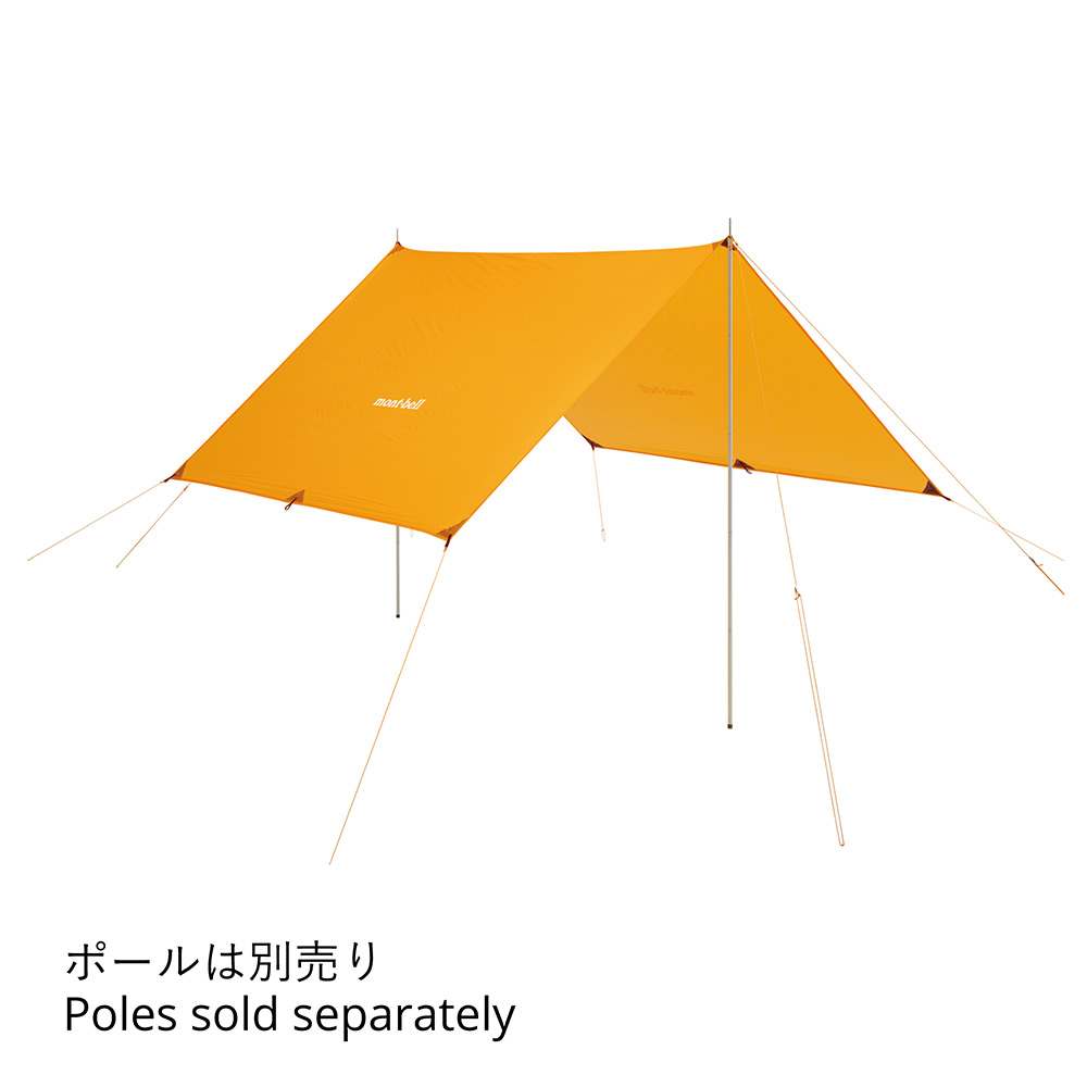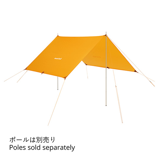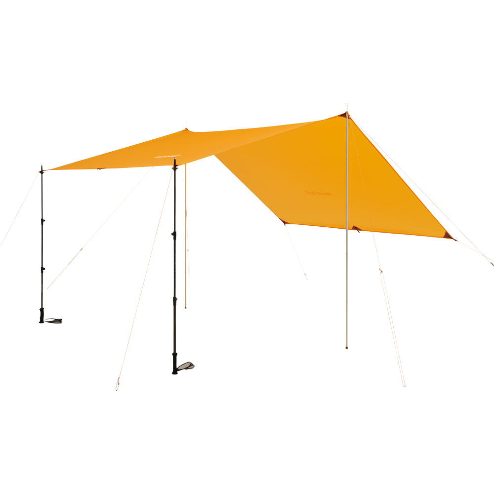 居住空間が広い長方形型タープです。軽量性と耐久性を両立した新開発のナイロンを使用。保水しにくく伸びにくいので、生地の垂れ下がりが少なくハリを保ちます。トレッキングポールなどでも設営できるループが付いており、状況に合わせた設営が可能です。2~3人での使用に適したサイズです。ポールは別売です。