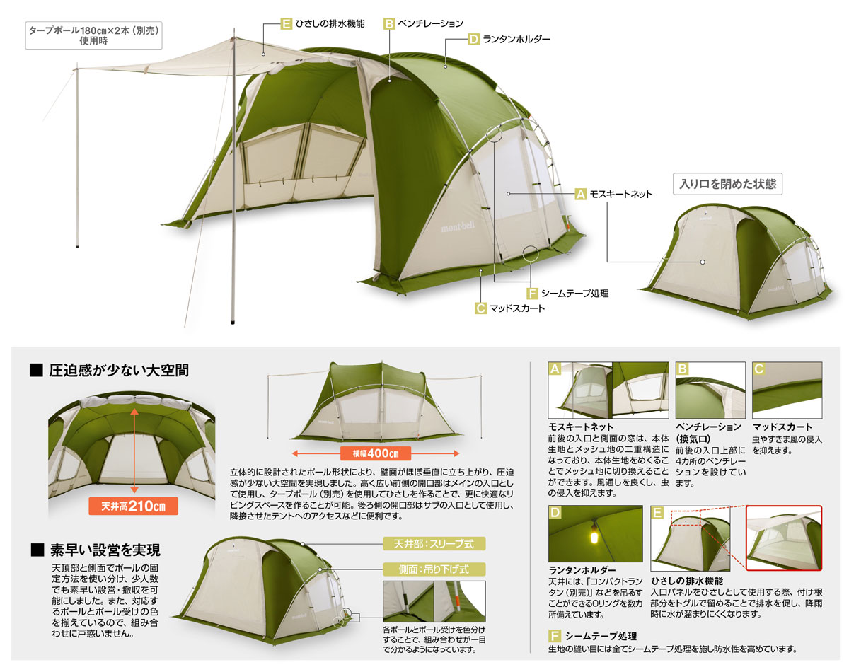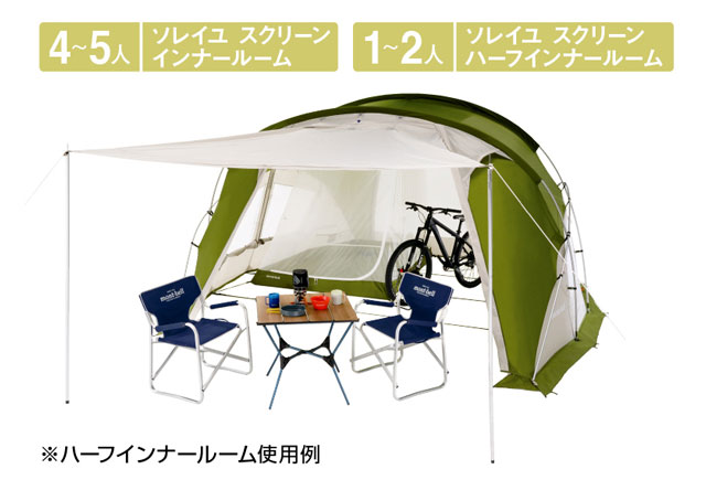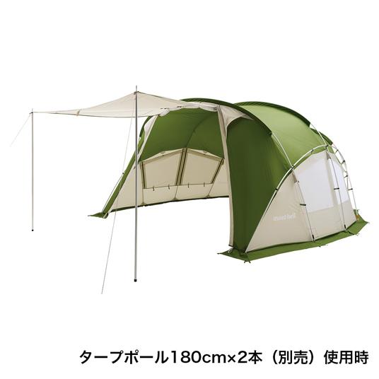 家族や仲間が集うキャンプに最適な4~6人用の自立式タープです。立体的に設計されたポール形状により、壁面がほぼ垂直に立ち上がり、多人数でも伸び伸びと過ごせる大空間を実現しました。