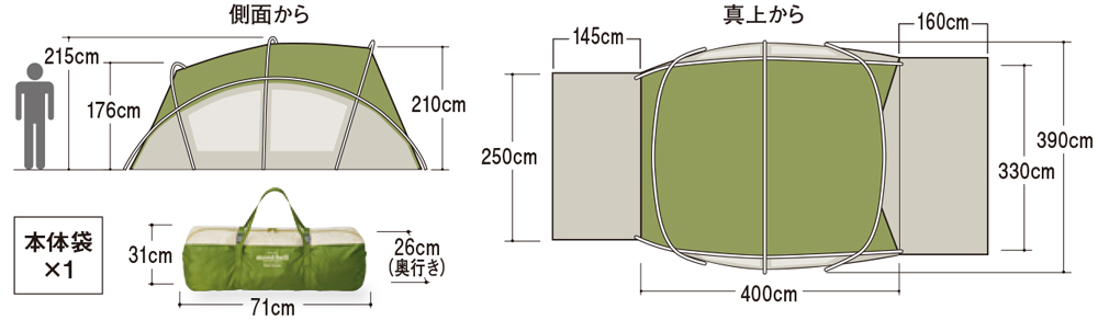 【構成】タープ本体1、本体ポール5本、Φ3mm反射材入り張り綱6本、19cmアルミVペグ14本、27cmアルミVペグ6本、ポール応急補修用パイプ1、本体スタッフバッグ1、ペグ用スタッフバッグ1、ポール用スタッフバッグ1