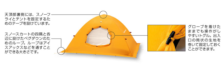 ステラリッジ テントの防寒防風性を高め、積雪期での使用に対応するためのスノーフライです。耐候性の高い生地を使用し、天井や四隅には補強を施すことで耐久性を高めています。出入口は筒状の吹き流しタイプで、巾着のように口をひもで絞って開閉を行うため、凍結による破損の恐れが少なく、降雪時にも出入りしやすくなっています。スタッフバッグ付き。