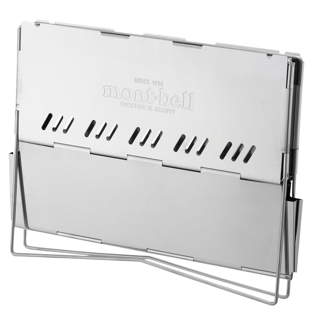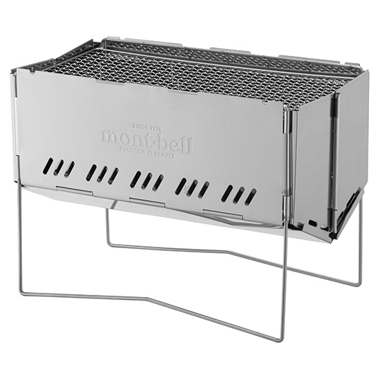 簡単に折り畳んで持ち運びができるたき火台です(意匠登録済)。独自の二重・深型構造が高い燃焼効率を実現しました。本体とロストルには丈夫でメンテナンスが容易なステンレス鋼を使用。焼き網が付属し、バーベキューが楽しめるだけでなく、別売の「クッカースタンド(#1122713)」を装着してダッチオーブンなどを使用することもできます。