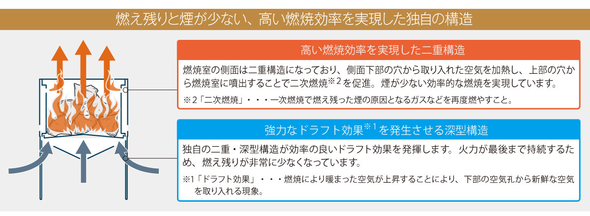 ※二次燃焼:一次燃焼で燃え残った煙の原因となるガスなどを再度燃やすこと。