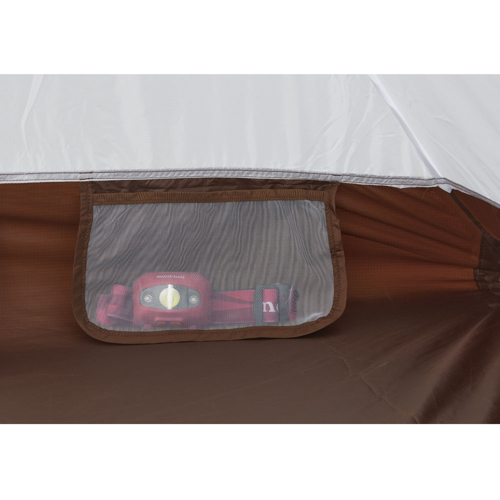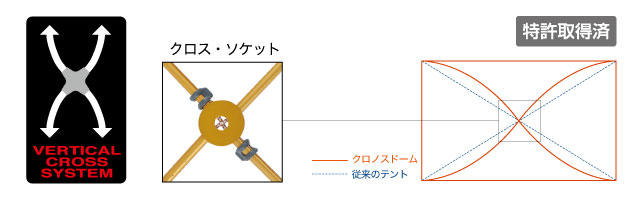 4本のポールをテント上部で直角に交差させ、クロス・ソケットで固定する独自開発のシステム。直角に交わることで、天頂部分が外側に大きく張り出し、居住空間を最大限に確保します。また、本体ポールにカーブをつけることで本体の張り出しを最大限に確保しています。全てのポールとソケットがショックコードで一体となっているため、素早い設営・撤収が可能です。