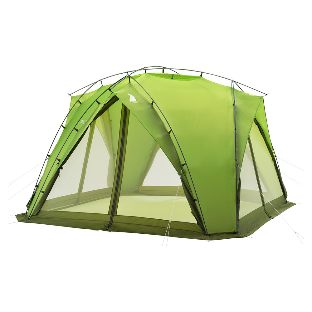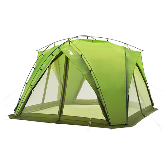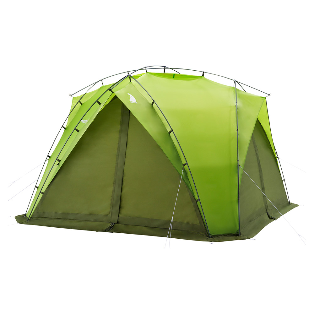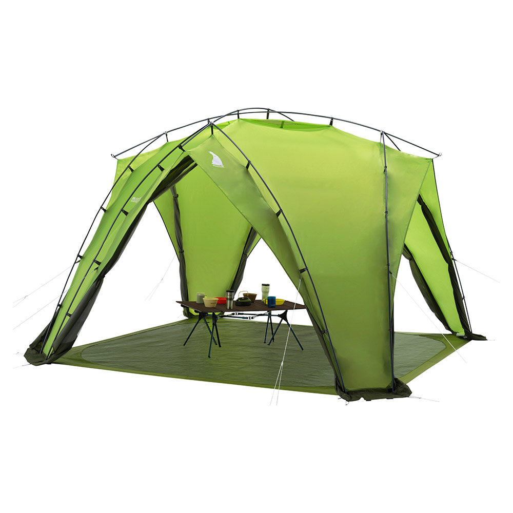 壁面をほぼ垂直に立ち上げることで居住空間を広げ、居心地の良いリビングスペースを作り上げる自立式タープ。一人でも簡単に設営できる構造です。