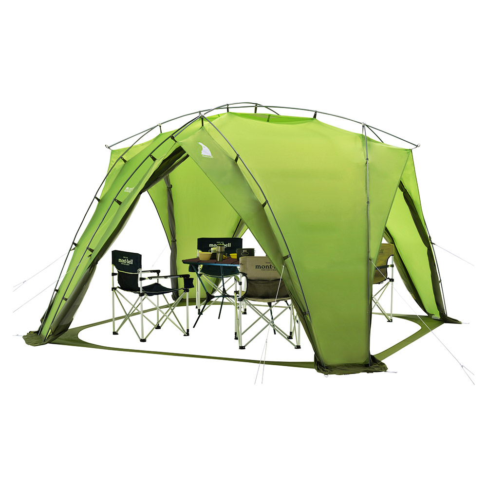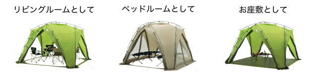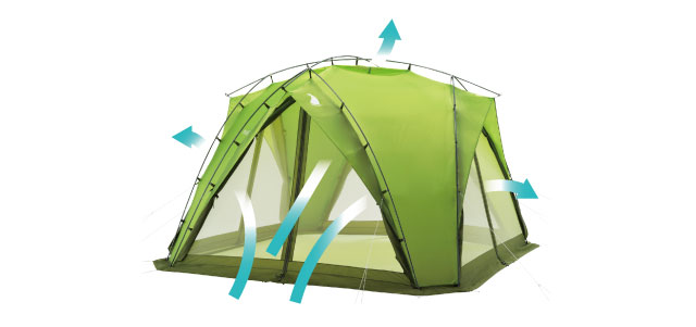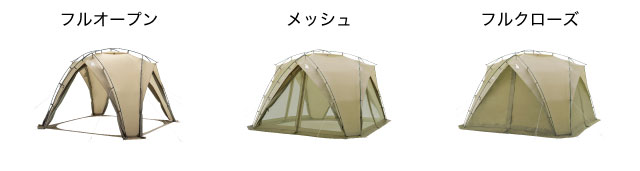 すべての面が生地とメッシュ地の二層になっているので、メッシュ地だけの状態にして蚊帳のようにしたり、4方向を全開にして開放感のある大型タープとして使用することができます。室内から開閉できる独自のベンチレーションシステムにより、雨天時や夏場でも快適に過ごしていただけます。