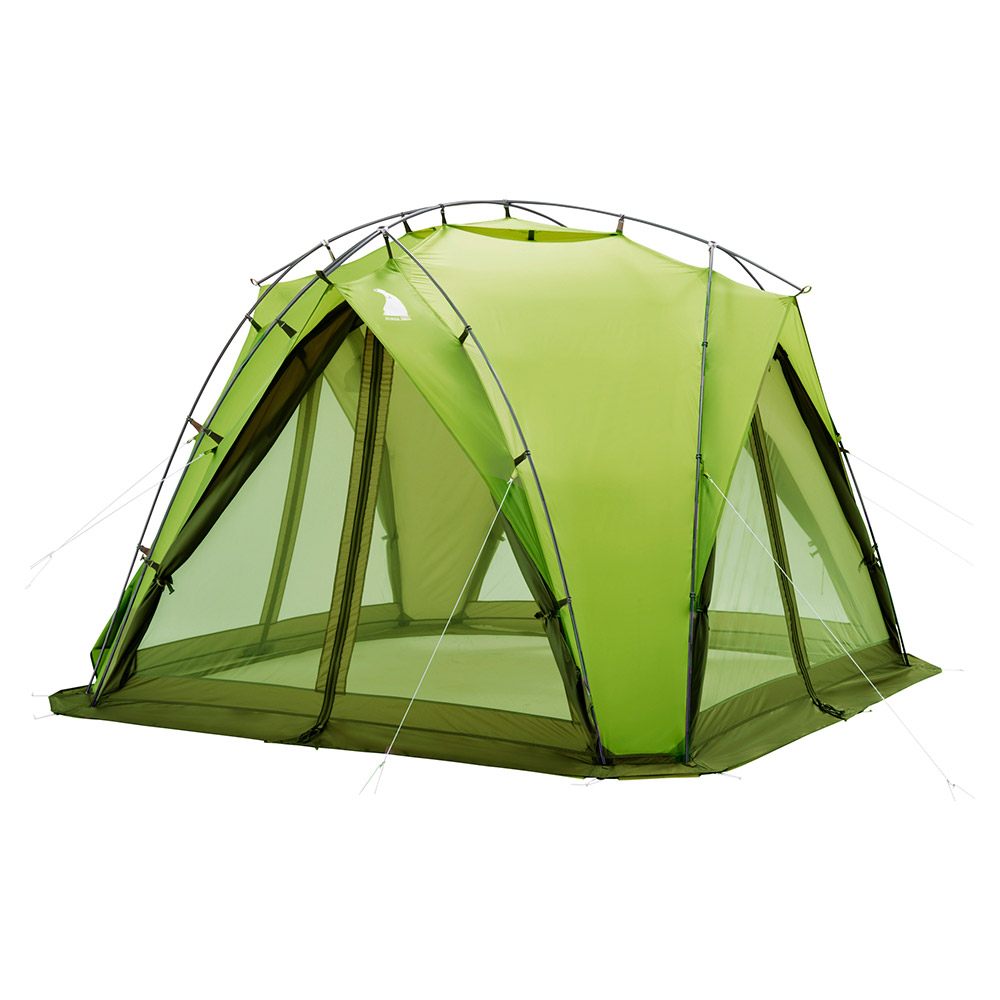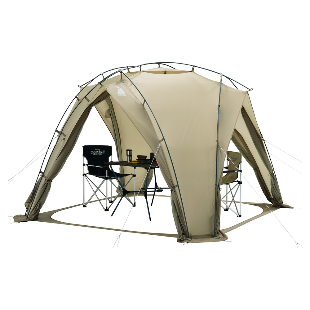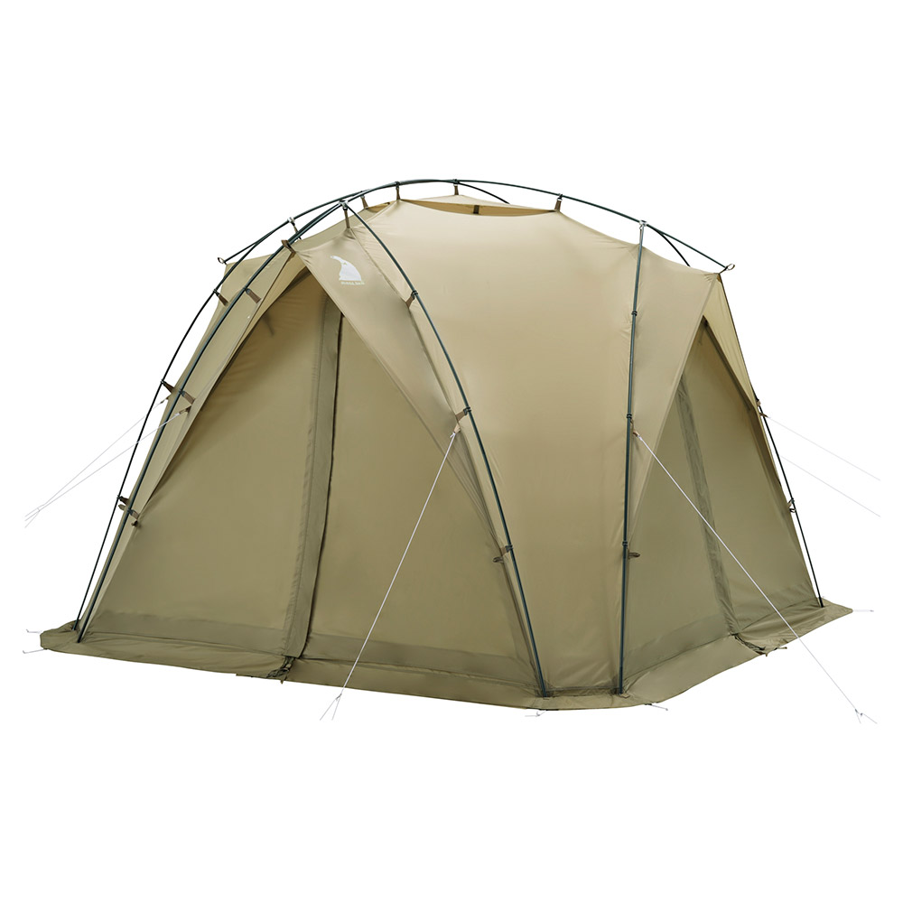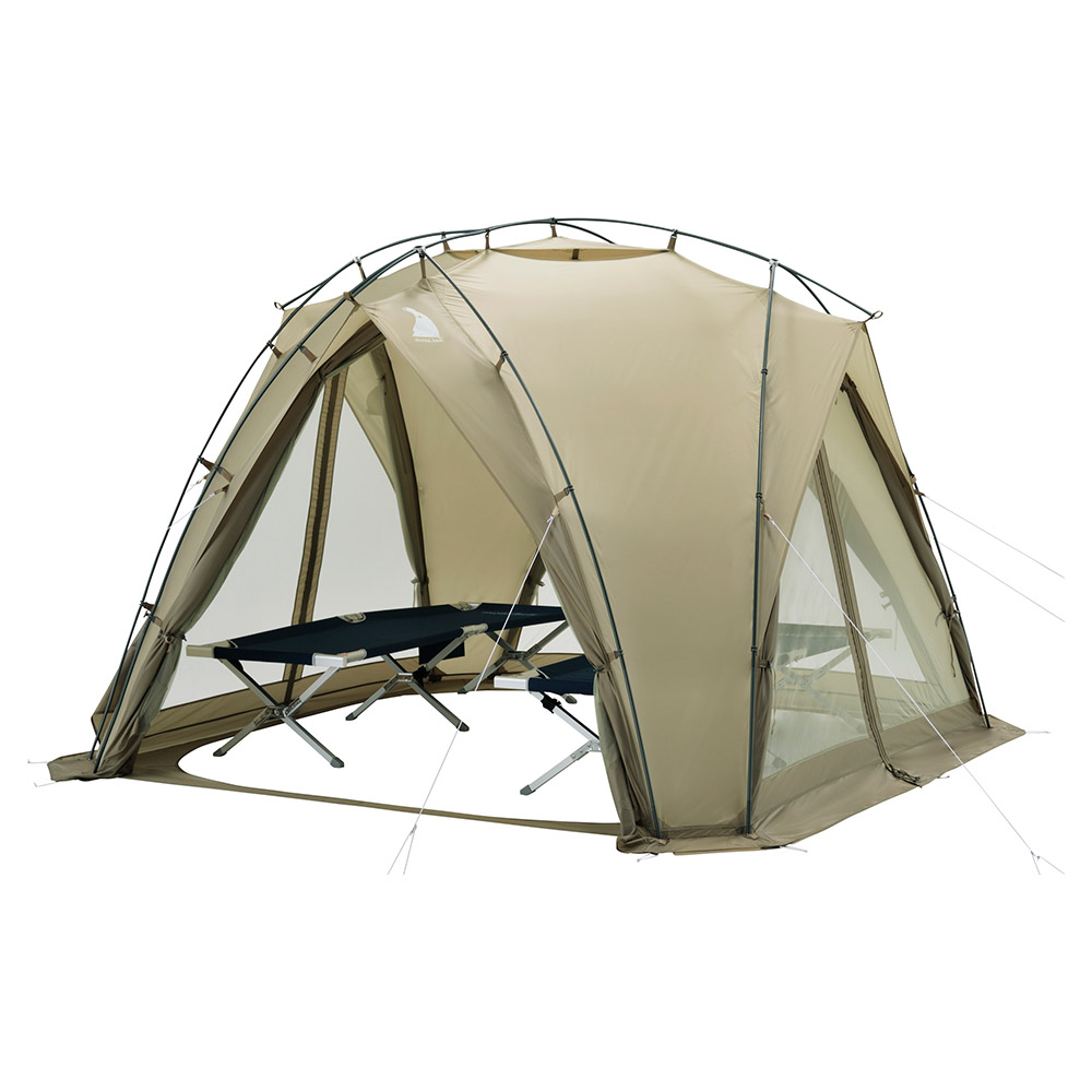 壁面をほぼ垂直に立ち上げることで居住空間を広げ、居心地の良いリビングスペースを作り上げる自立式タープ。一人でも簡単に設営できる構造です。
