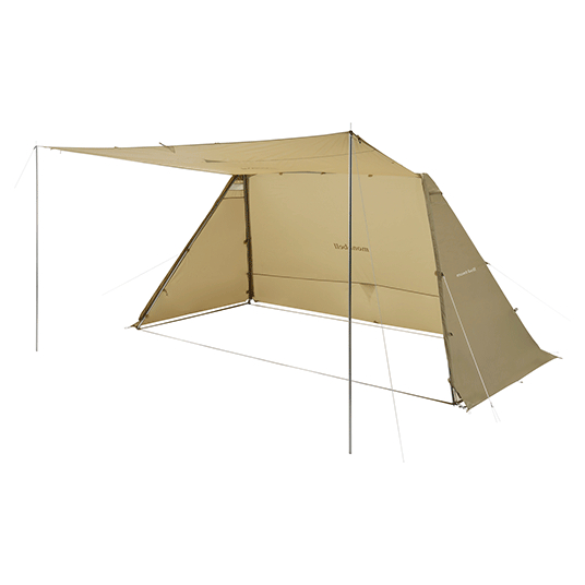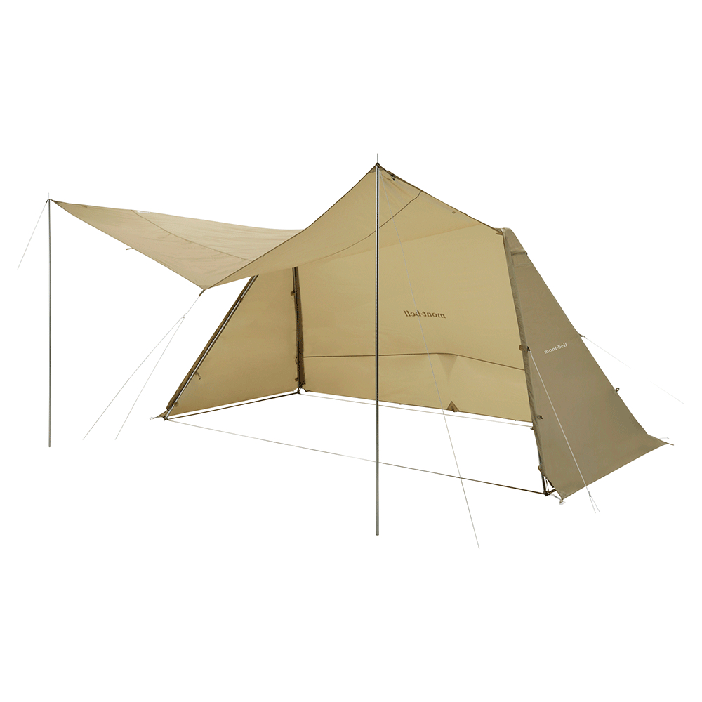 一般的なタープとしての使用だけではなく、ひさしを片側だけ閉じてプライベートな空間を演出したり、両側を閉じて簡易的なシェルターとして使用したり、工夫次第でさまざまな使い方ができます。タープ本体の両サイド上部に換気用のメッシュ窓があります。