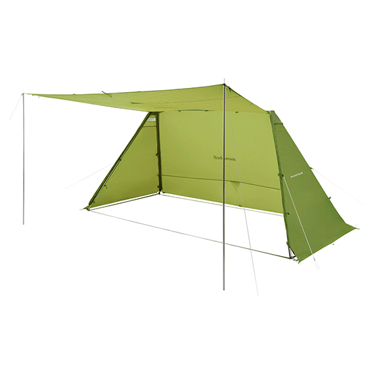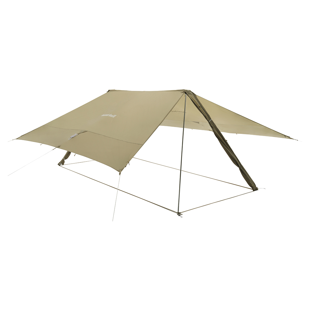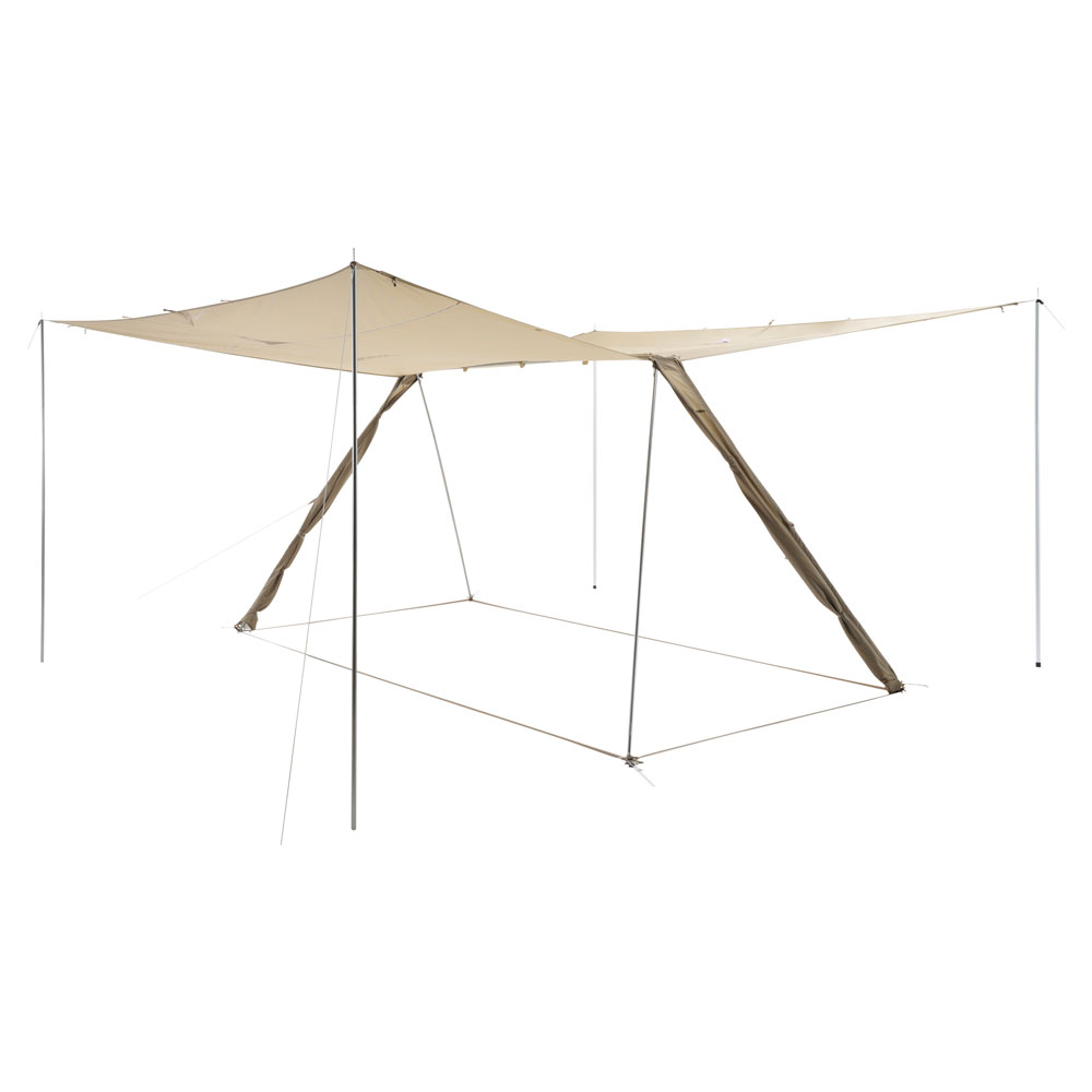 フレームを組み立ててタープ本体を被せるだけで1人でも簡単に設営できる、軽量・コンパクトな半自立式タープです。