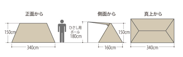 【構成】タープ本体1、Aフレーム2セット、センターポール1本、ひさし用ポール2本、フロアテープセット1、19cmアルミVペグ14本、張り綱12本、ポール応急補修用パイプ1本