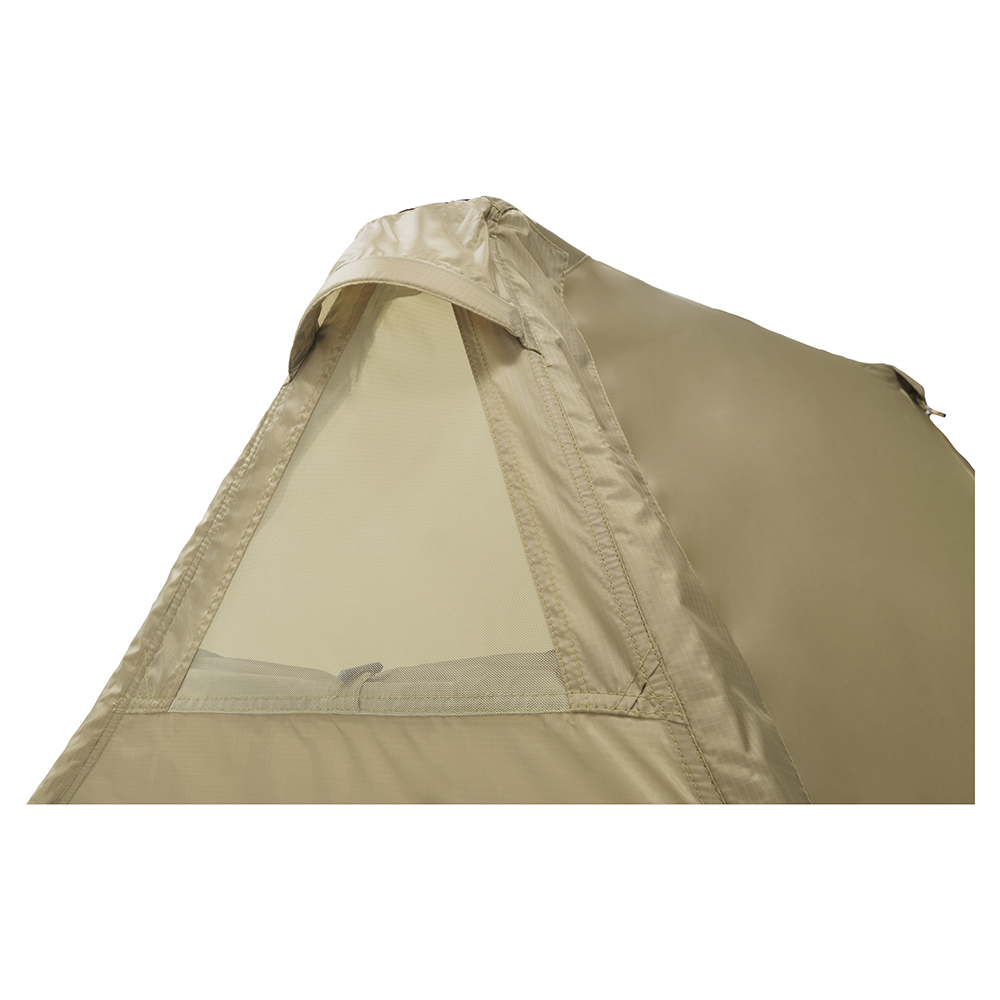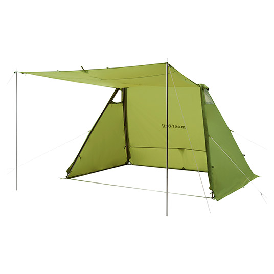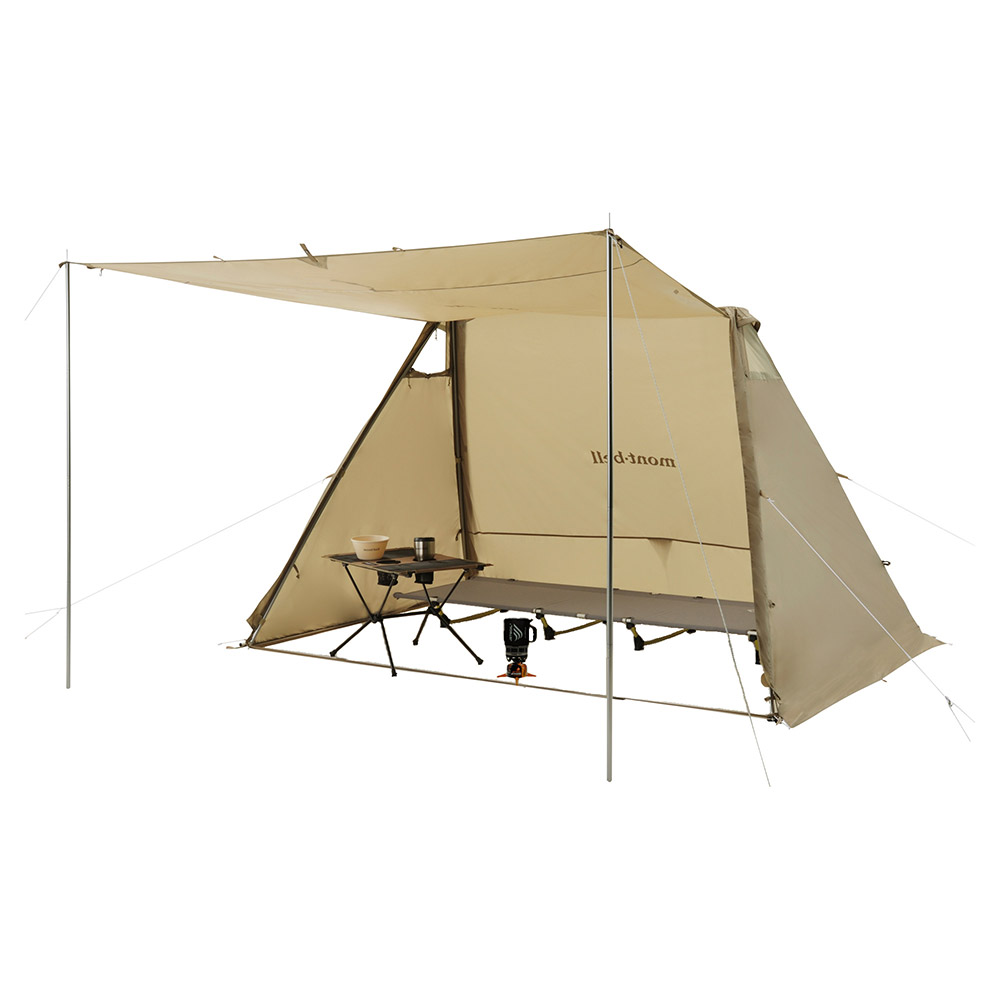 一般的なタープとしての使用だけではなく、ひさしを片側だけ閉じてプライベートな空間を演出したり、両側を閉じて簡易的なシェルターとして使用したり、工夫次第でさまざまな使い方ができます。タープ本体の両サイド上部に換気用のメッシュ窓があります。