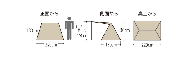 【構成】タープ本体1、Aフレーム2セット、センターポール1本、ひさし用ポール2本、フロアテープセット1、16cmアルミVペグ14本、張り綱12本、ポール応急補修用パイプ1本