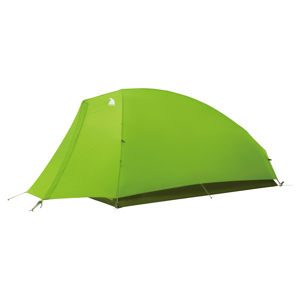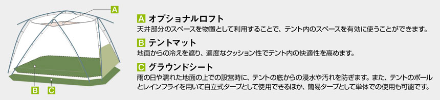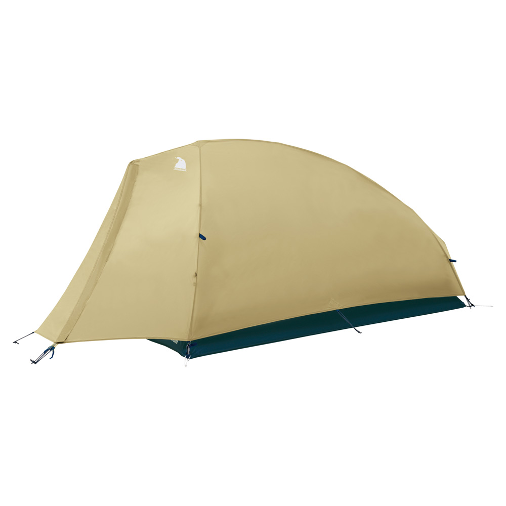 【構成】テント本体1、レインフライ1、本体ポール1組、Φ2mm反射材入り張り綱4本、16cmアルミVペグ12本、ポール応急補修用パイプ1本