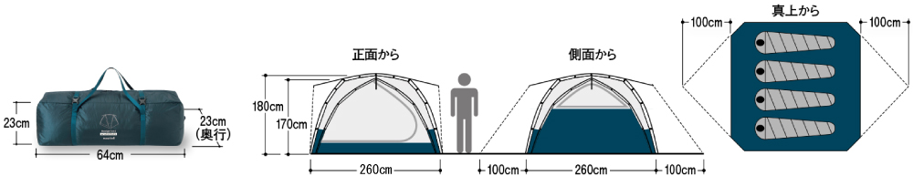 【構成】テント本体1、レインフライ1、本体ポール2組、Φ3mm反射材入り張り綱8本、16cmアルミVペグ18本、ポール応急補修用パイプ1本