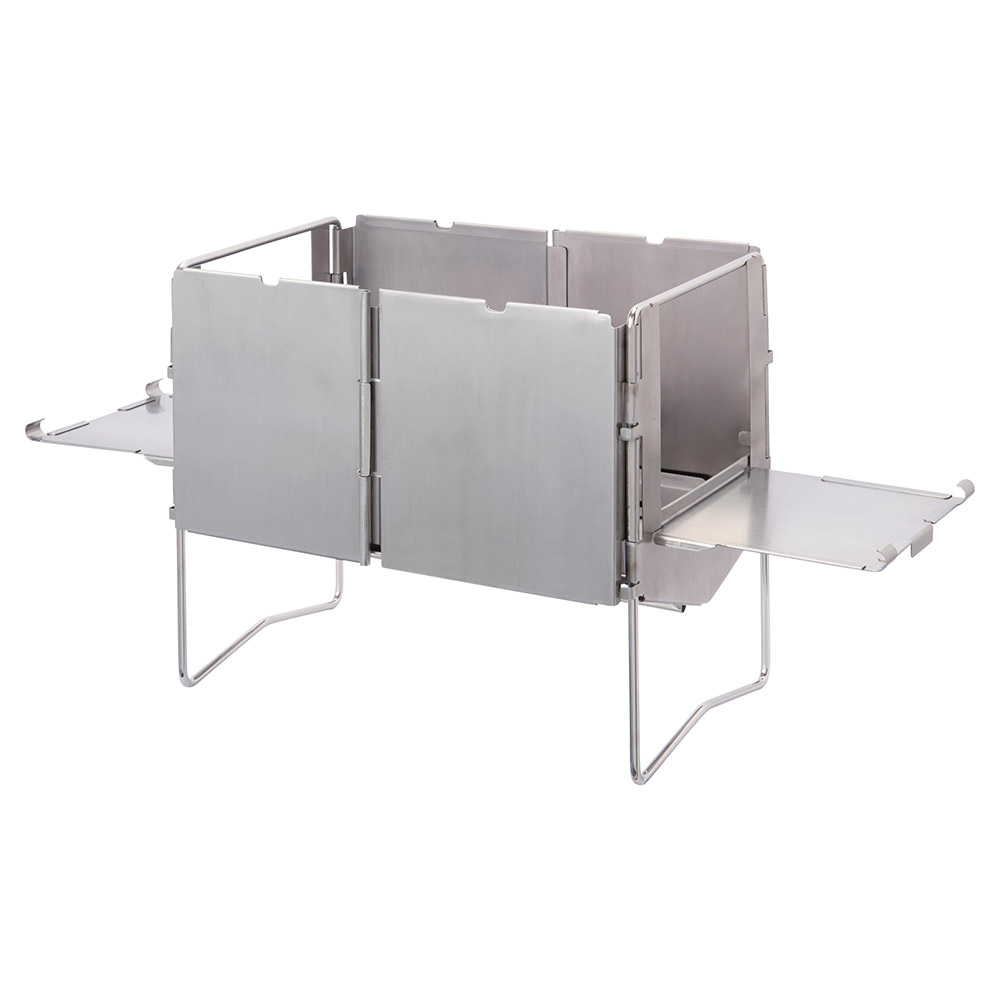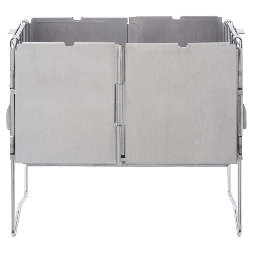 簡単に折り畳んで持ち運びができ、キャンプやツーリングに適した軽量コンパクトなたき火台です。丈夫でメンテナンスが容易なステンレス鋼を使用。火力が安定しやすい深型構造です。両側面が開くため、調理中でも長い枝を切らずに追加投入できます。別売の「コンパクト ファイヤーピット クッカースタンド(#1122770)」を装着しクッカーなどを使用することもできます。