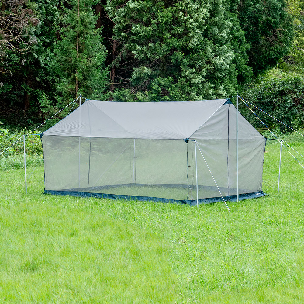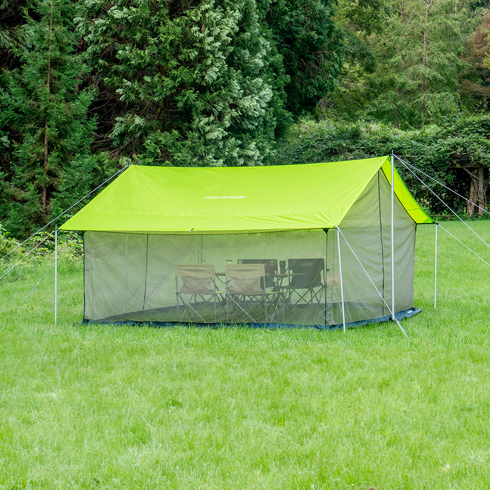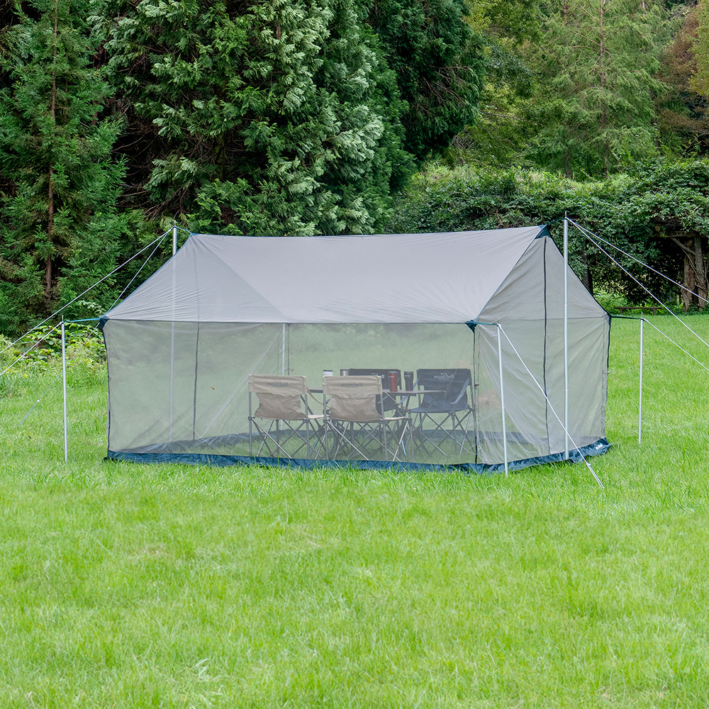 オプショナルメッシュのみで設営する場合、メインポール:アルミタープポール210 x 2本、サブポール:アルミタープポール120 x 4本、張り綱6本、ペグ8本(すべて別売り)が必要です。