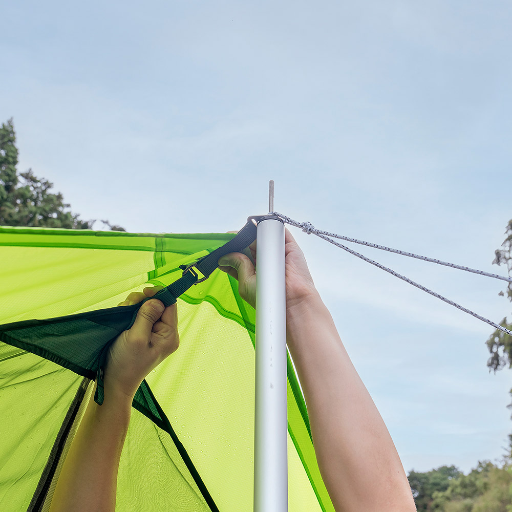 タープに設営する場合、メインポール:アルミタープポール210 x 2本(別売り)、サブポール:アルミタープポール120 x 4本(別売り)が必要です。