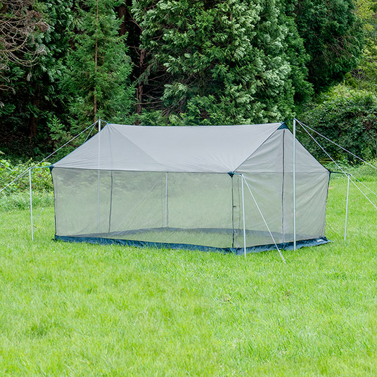 レクタタープにセットできるオプションの蚊帳です。通気性のよいメッシュ地で、キャンプの虫よけに適しています。タープを設営した後からでも、簡単にセットできます。タープを使用せずにオプショナルメッシュのみで設営する事も可能です。