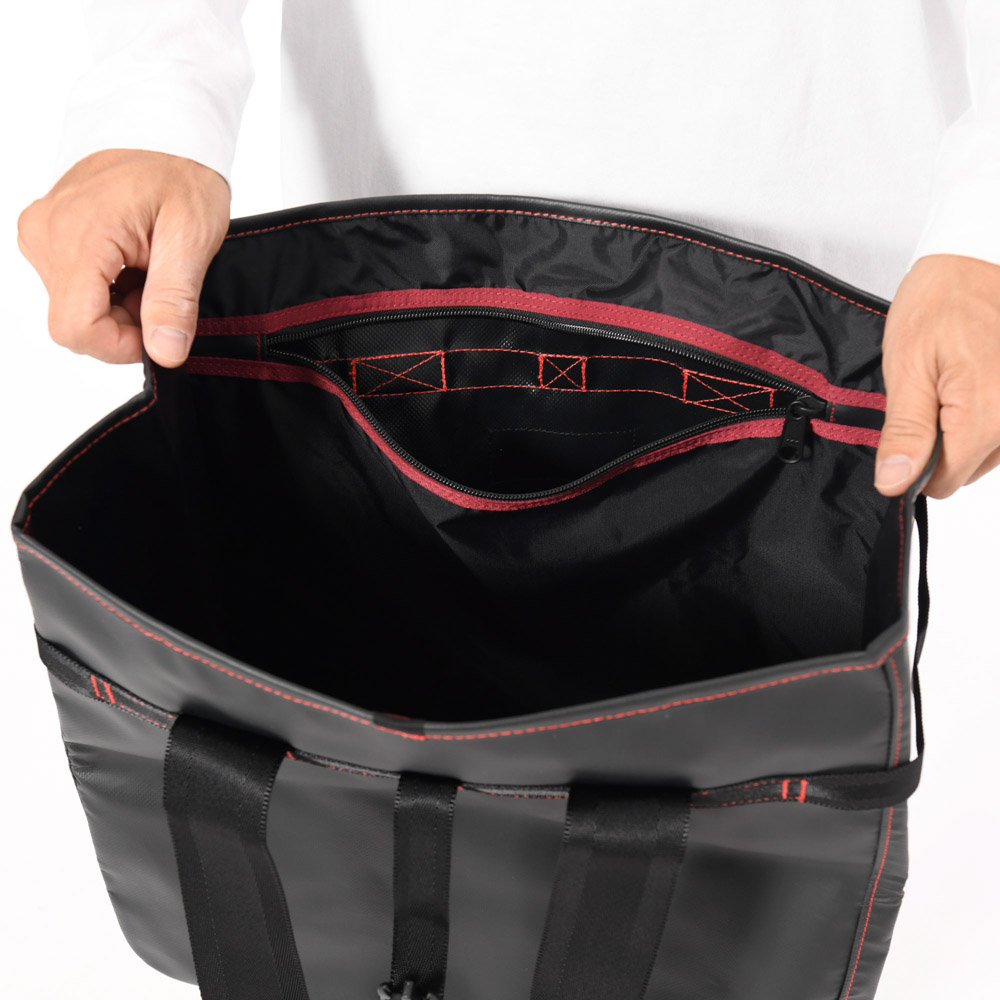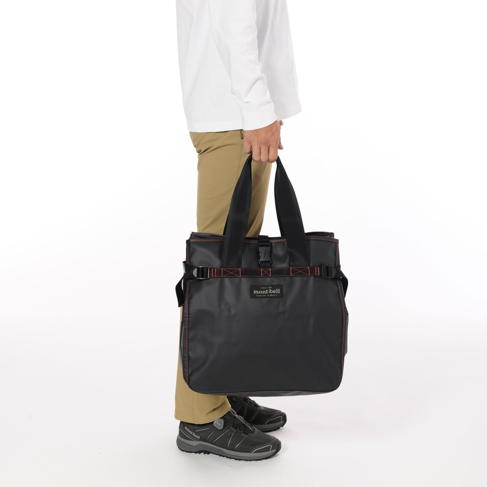 厚手で強度と耐水性に優れた生地を使用した、アウトドアでの使用に適したバッグです。上部周囲と出し入れ口のコンプレッションストラップを使って荷物の量に応じたサイズ調節が可能。ハンドグリップは肩から下げやすい長さになっています。※縫い目に防水処理は施していません。