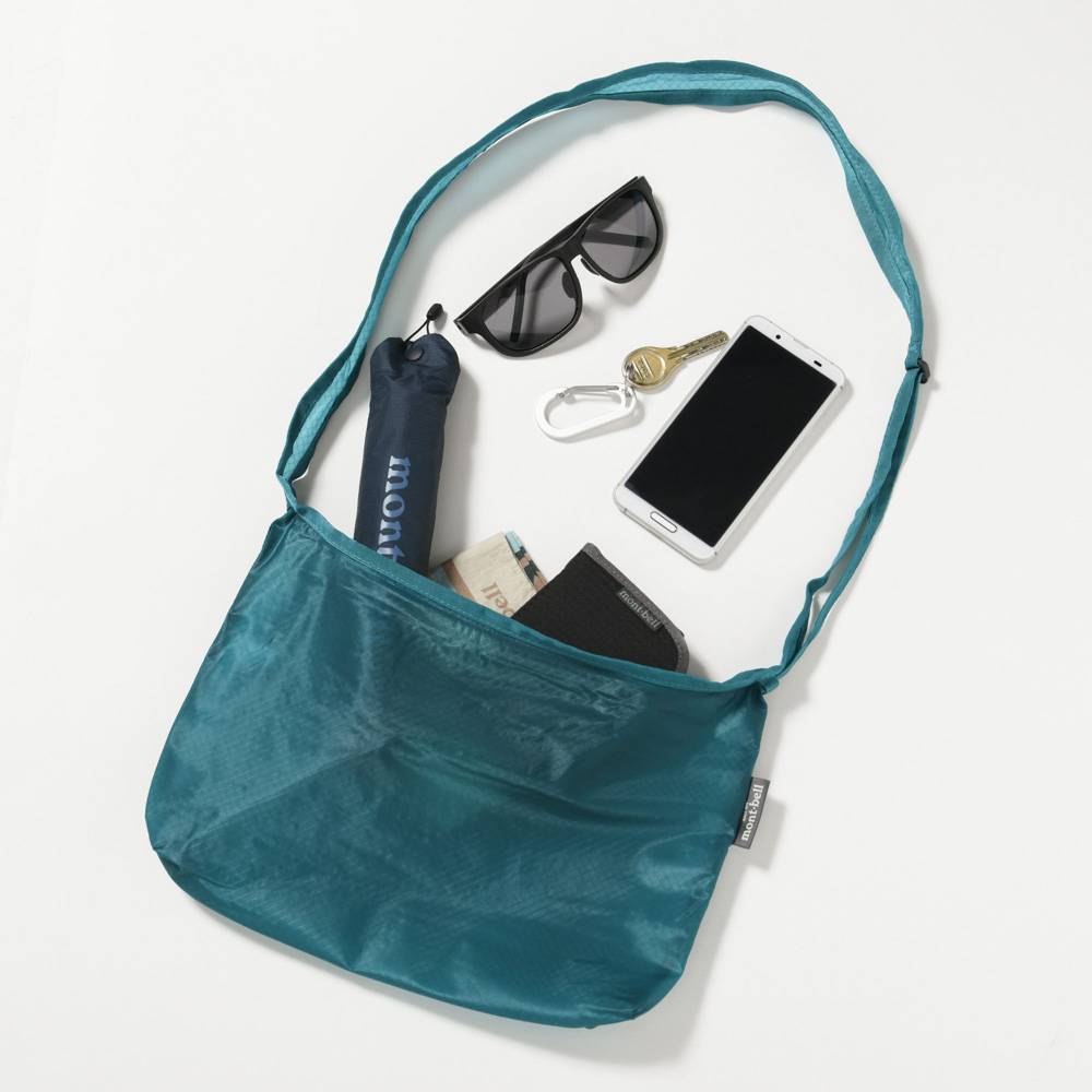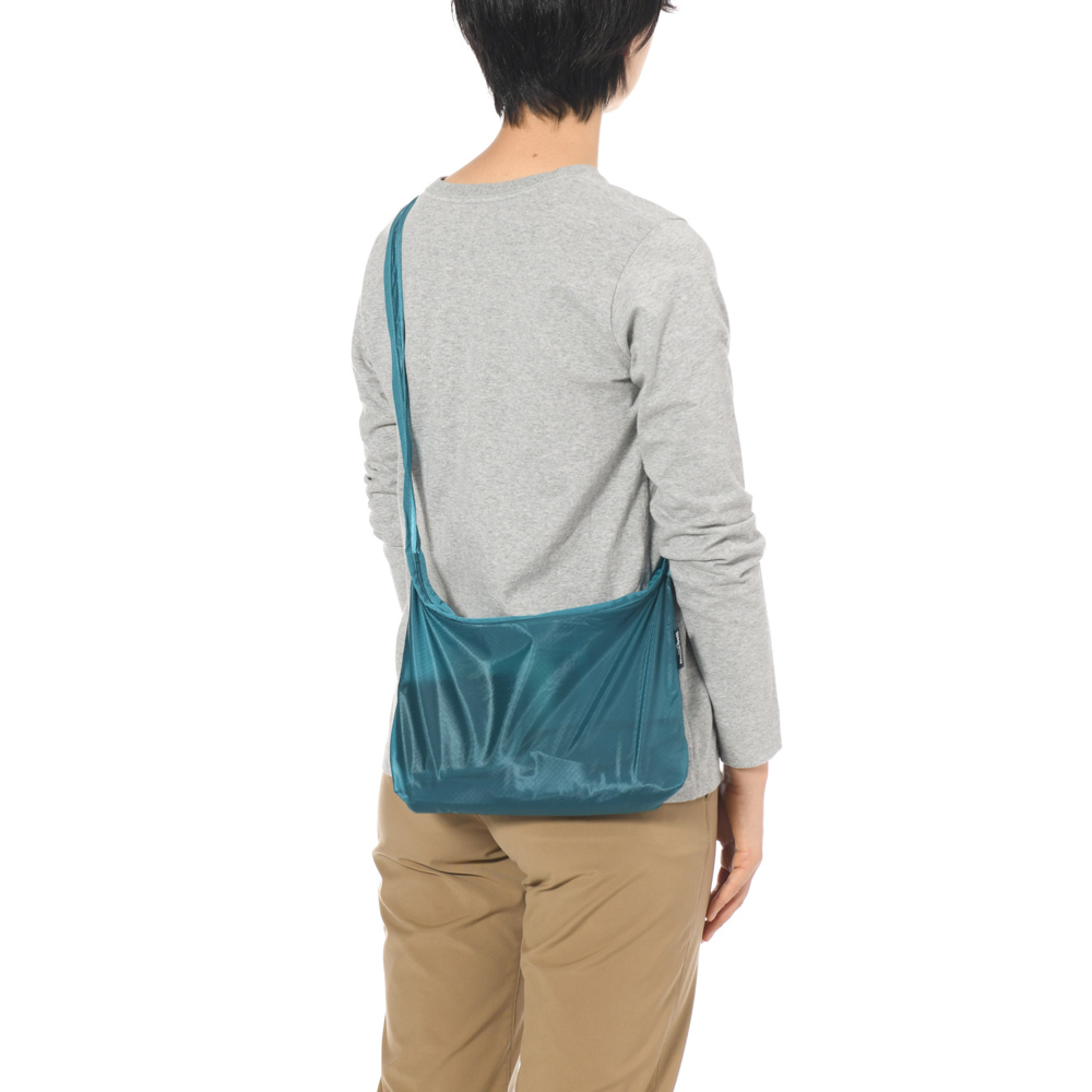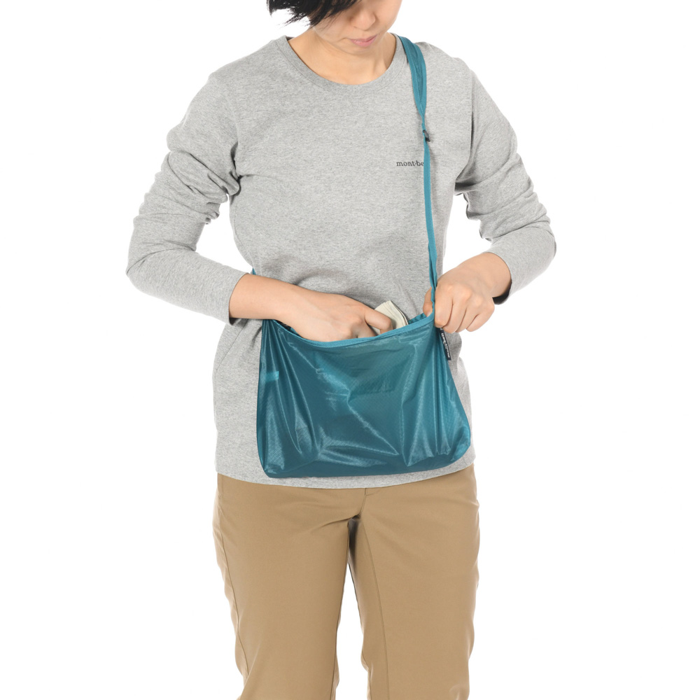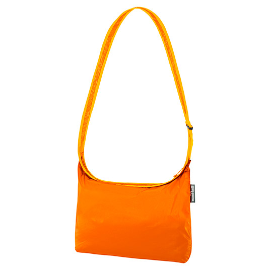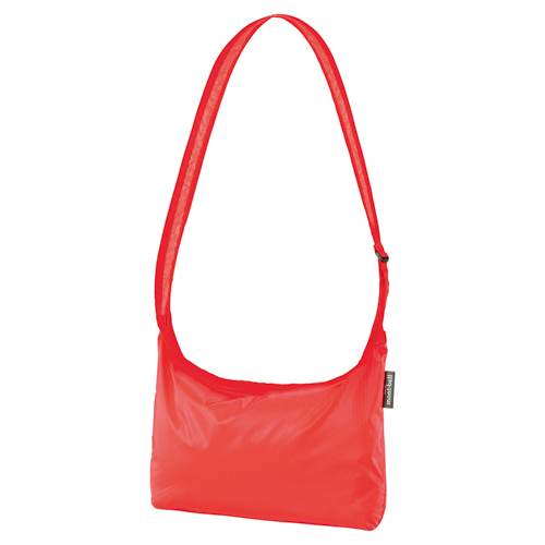 手のひらにすっぽりと収まる超軽量ショルダーバッグです。雑誌や書類、小物の収納に便利な横長形状。開口部にはジッパー付き。テープの長さは調節可能で、余りは本体に収納できます。B5サイズ対応。