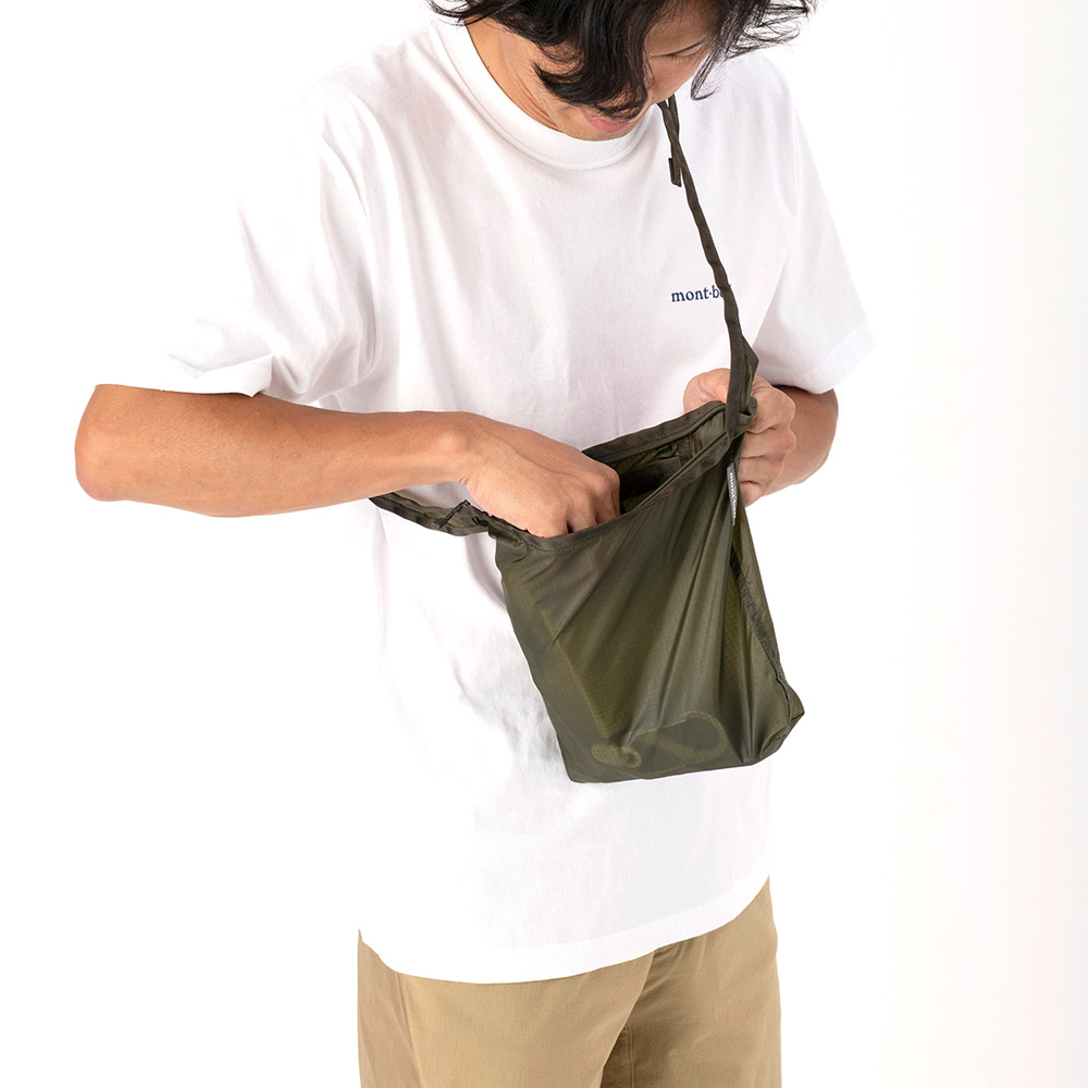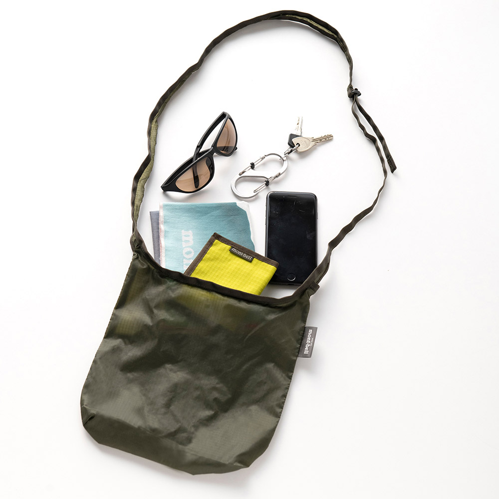 手のひらにすっぽりと収まる超軽量ポーチです。旅先や登山の際の小物の収納に便利な形状。開口部にジッパーを設けています。テープの長さは調節可能で、余りは本体に収納できます。A5サイズ対応。