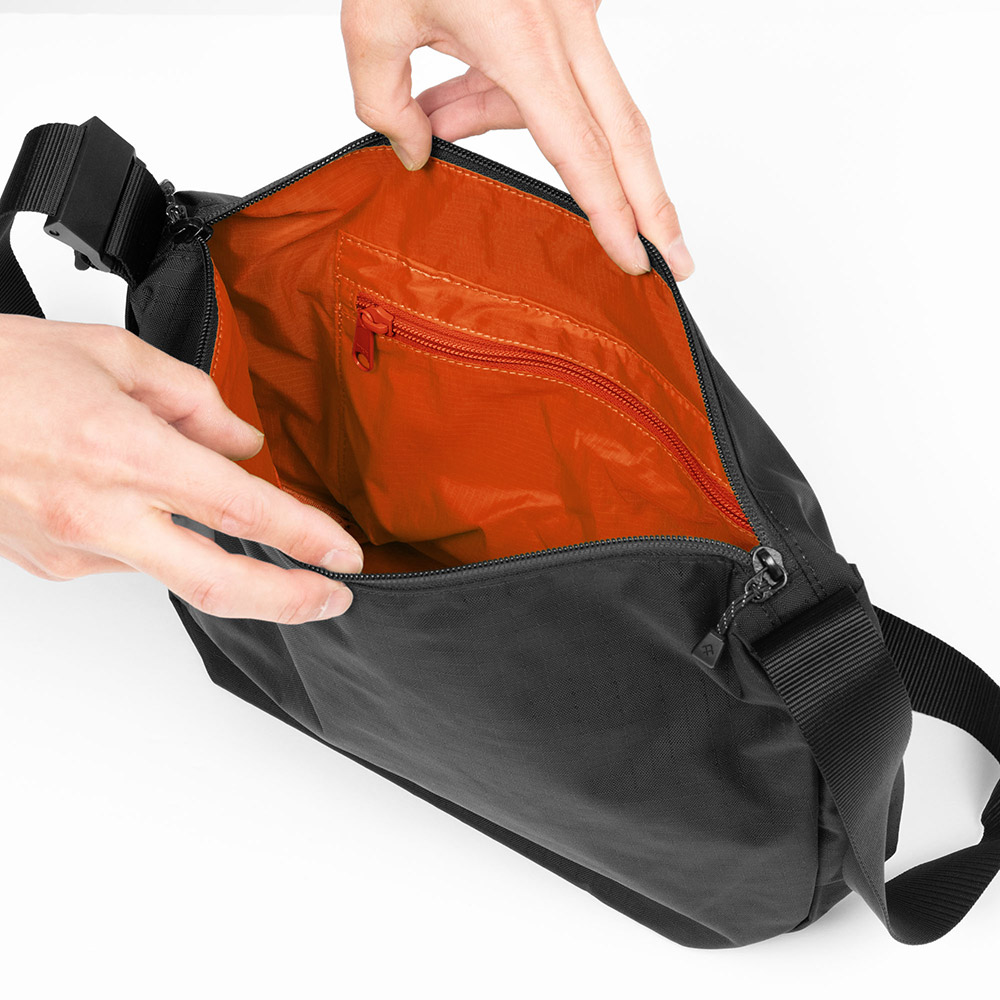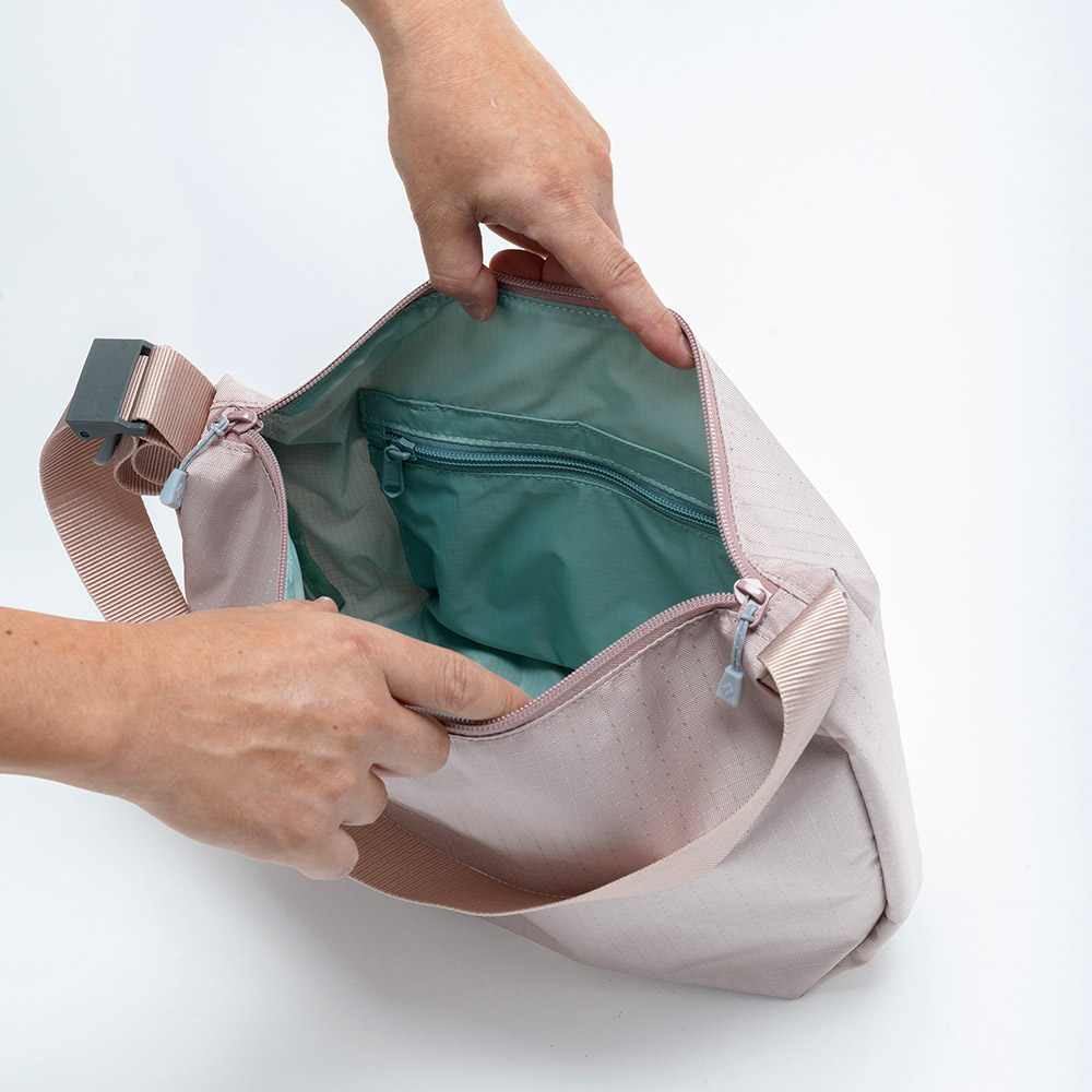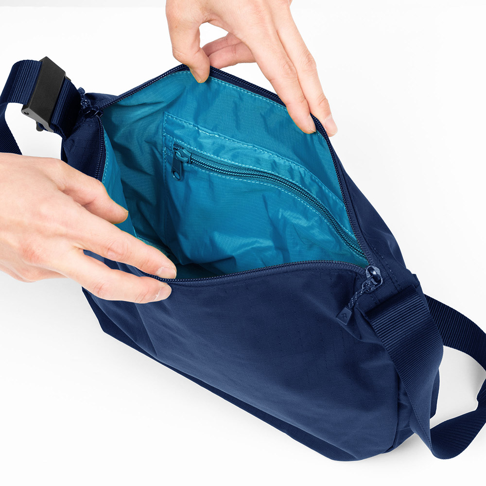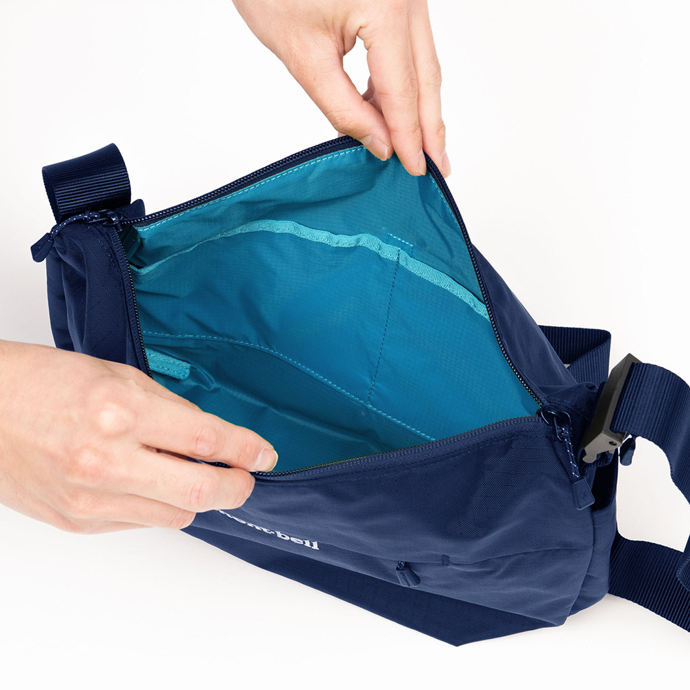 シンプルなデザインで、普段使いからトラベルまで使い回しの利くショルダーバッグです。ショルダーストラップの長さはワンタッチで調節でき、肩掛けにも斜め掛けにも対応するバッグです。ストラップの余りはサイドポケットに収納できるようになっています。内部にジッパー付きポケット(キーリーシュ付き)があります。