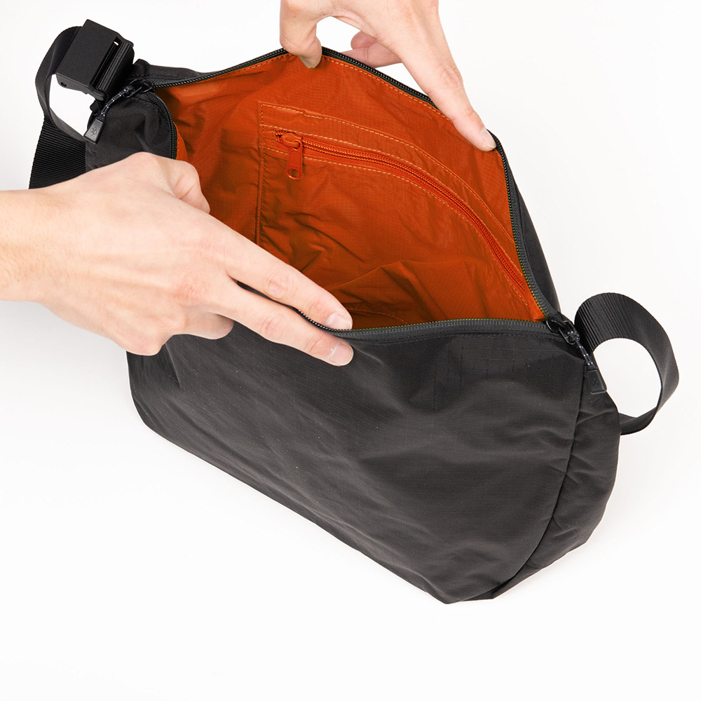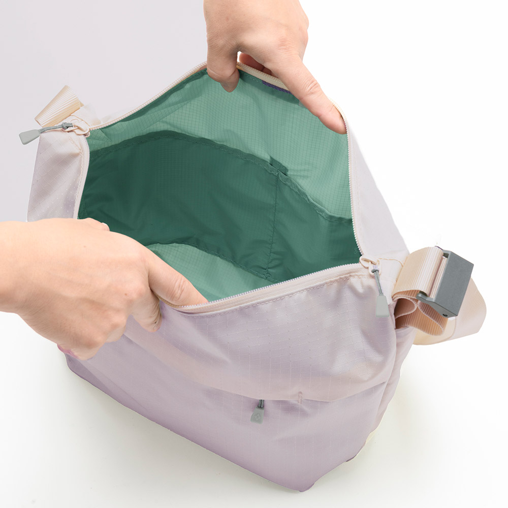 シンプルなデザインで、普段使いからトラベルまで使い回しの利くショルダーバッグです。ショルダーストラップの長さはワンタッチで調節でき、肩掛けにも斜め掛けにも対応するバッグです。ストラップの余りはサイドポケットに収納できるようになっています。内部にジッパー付きポケット(キーリーシュ付き)があります。