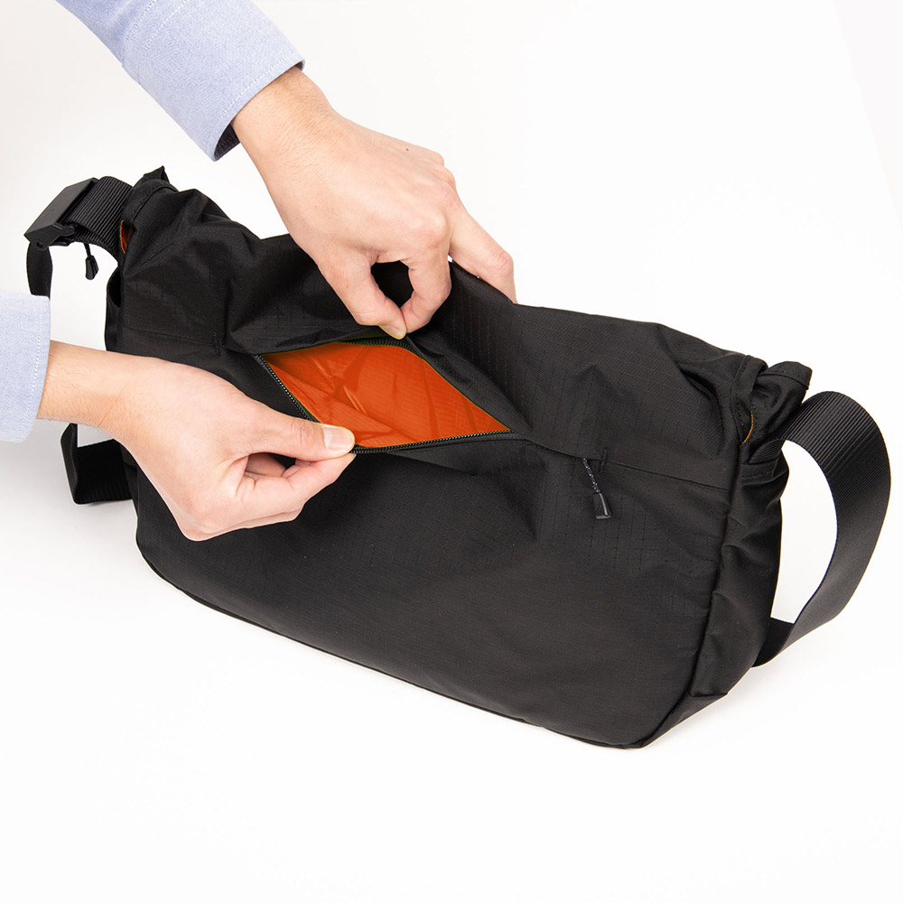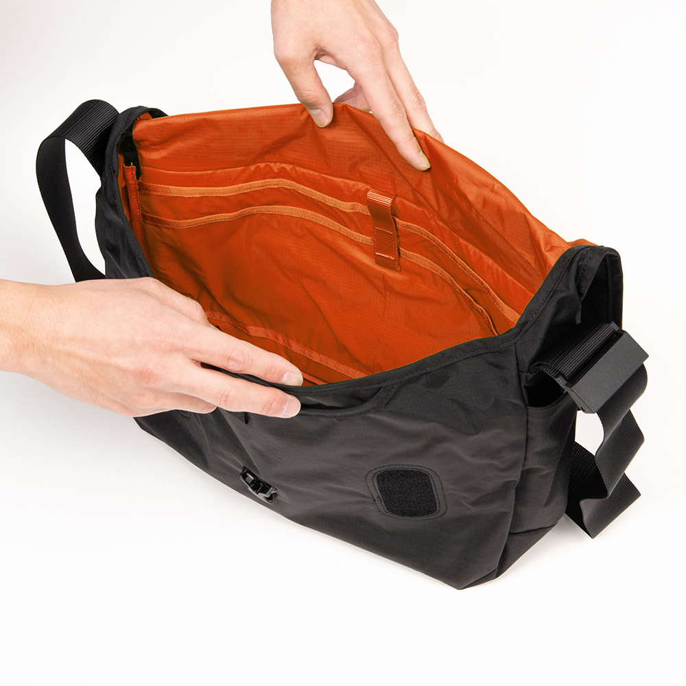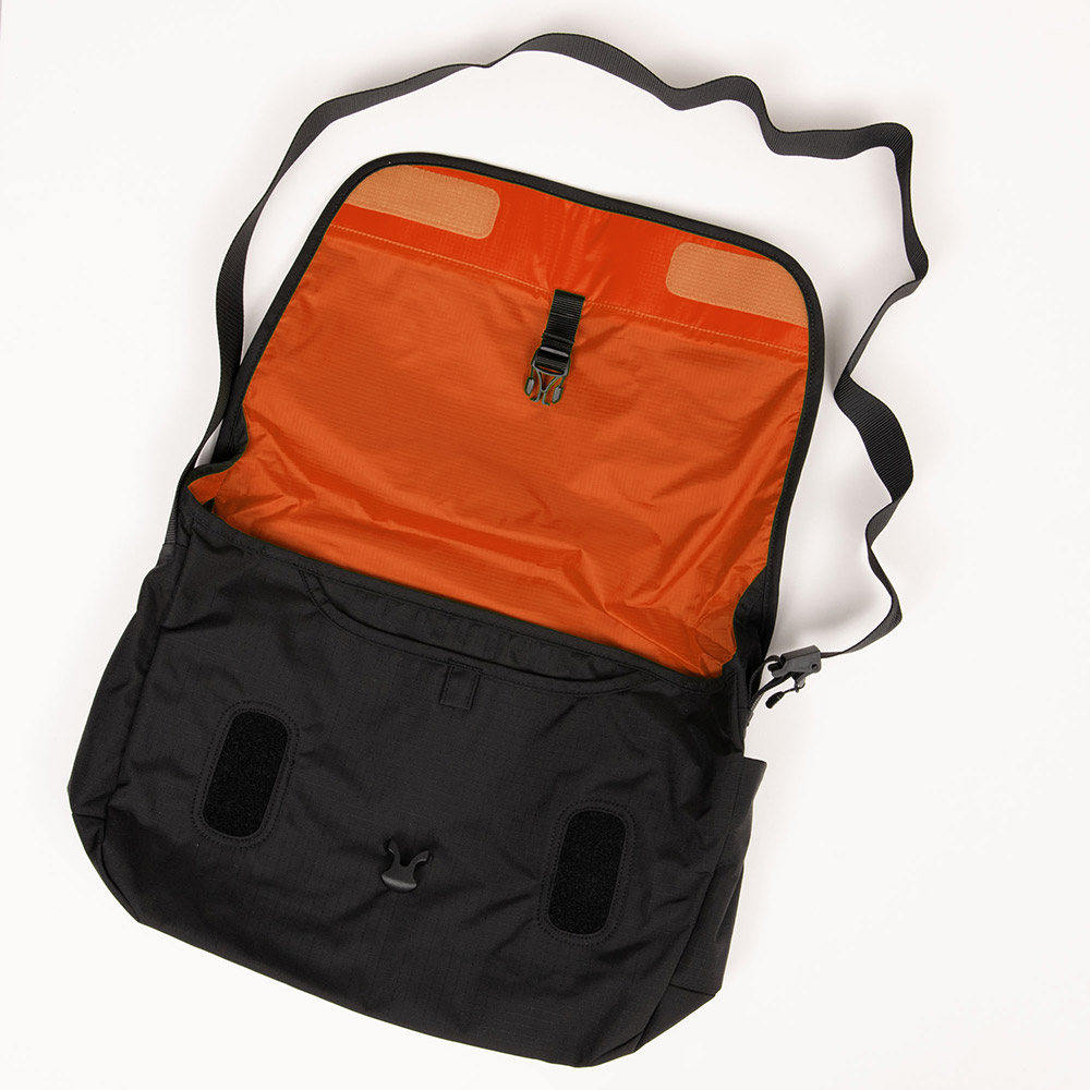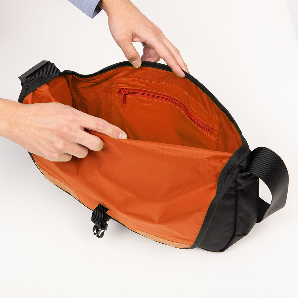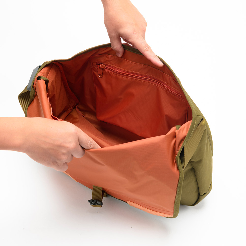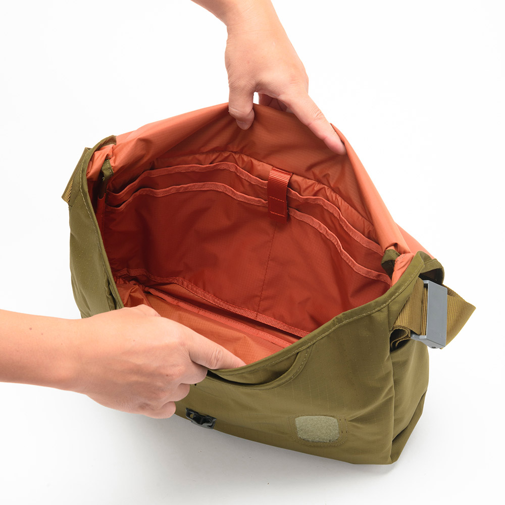 シンプルなデザインで、普段使いからトラベルまで使い回しの利くショルダーバッグです。大きなフラップを備えたシンプルな構造です。ショルダーストラップの長さはワンタッチで調節でき、肩掛けにも斜め掛けにも対応可能。ストラップの余りはサイドポケットに収納できるようになっています。内部にジッパー付きポケット(キーリーシュ付き)があります。