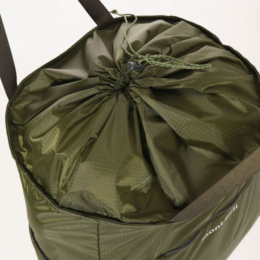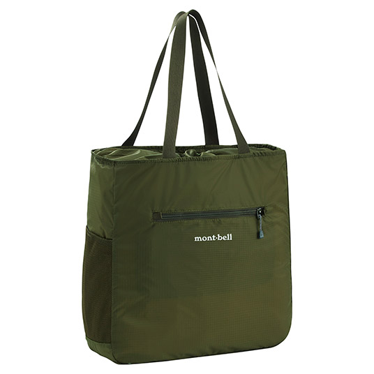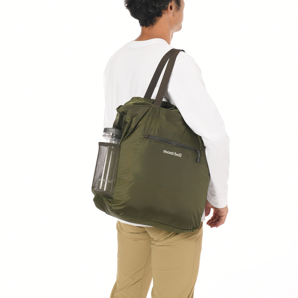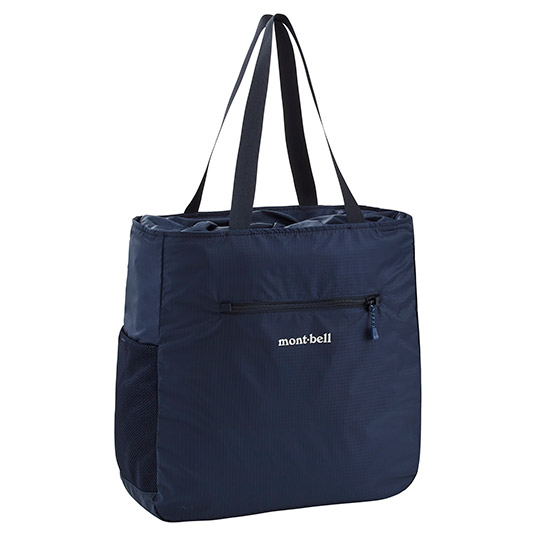 旅行のサブバッグや普段のエコバッグとして常時携行するのに適したトートバッグです。開口部には、荷物が落ちないようドローコード付きフラップを設けています。右サイドには、折り畳み傘やペットボトルなどが入れられるメッシュのポケット付き。