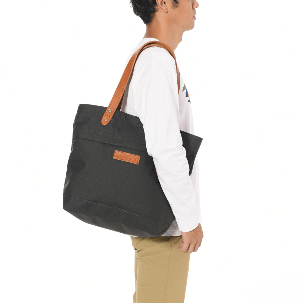耐久性に優れた素材を使用した丈夫なトートバッグです。B4サイズに対応します。開口部は真ん中のスナップボタンで閉じることができ、荷物が飛び出しにくくなっています。ハンドグリップには上質で厚みのある牛革を使用しています。