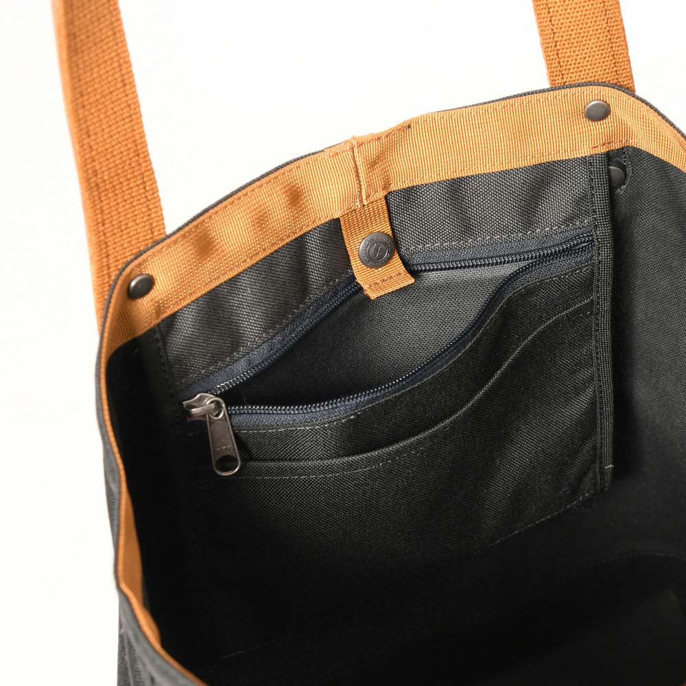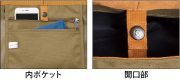 内部にジッパー付きの内ポケットが付いています。開口部はスナップボタンで閉じることができます。
