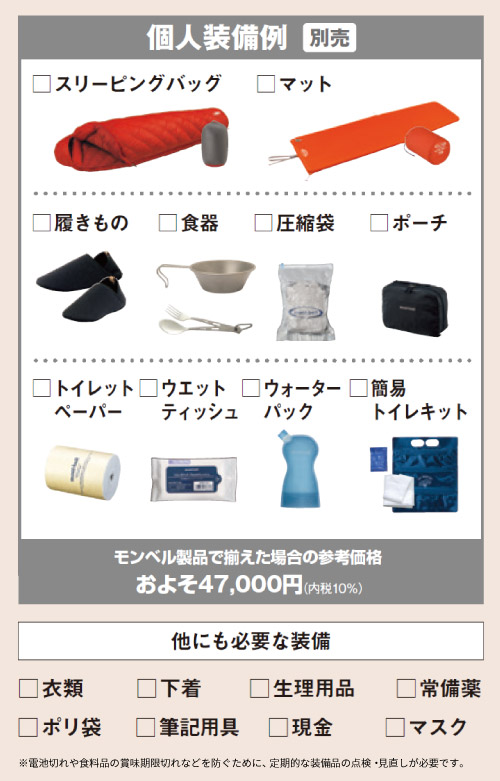 避難所や屋外での生活時(二次避難)を想定した、1人分の装備を収納できるパックです。暗闇で光に反射して光るリフレックマーク、IDタグ付き。