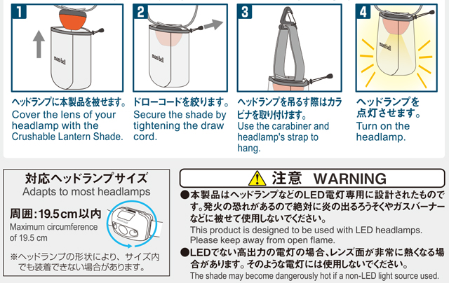 お持ちのヘッドランプをランタンに早変わりさせてしまう、新発想の超軽量コンパクト・ランタンシェードです。半透明で柔らかなシェード本体をヘッドランプにかぶせると、目に優しい光が広範囲に広がります。使用しないときは平たくたためばかさばらず、持ち運びも便利です。付属のミニカラビナを取り付けて、テント内などで吊り下げて使用できます。