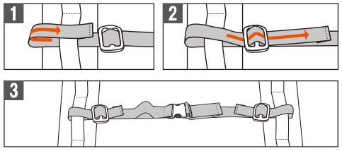テープアジャスターを用いてショルダーハーネスに固定します。